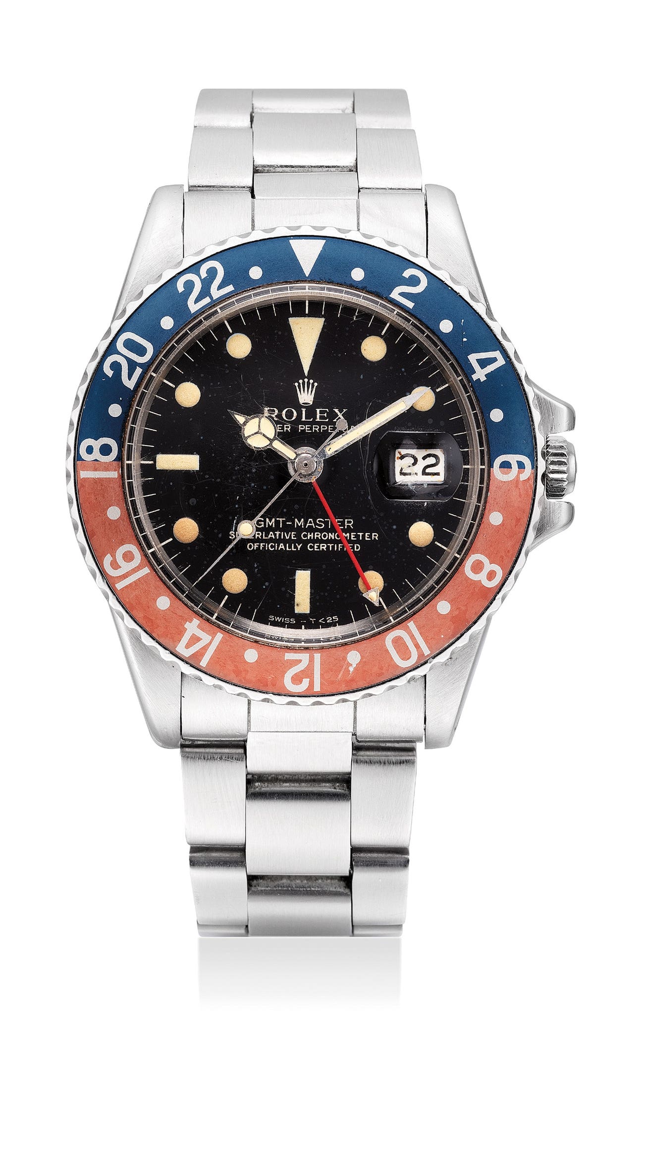 The present example from 1966 features its original stunning black glossy dial with gilt print, with tritium hour markers that have aged to a lovely light yellow color. The “Swiss-T<25” is correct for the period. The bezel has faded slightly with the red an appealing light tone, while the blue retains a deep hue. The Rolex GMT-Master is a watch of charisma with great wearability, this example offers tremendous value and practicality for collectors.