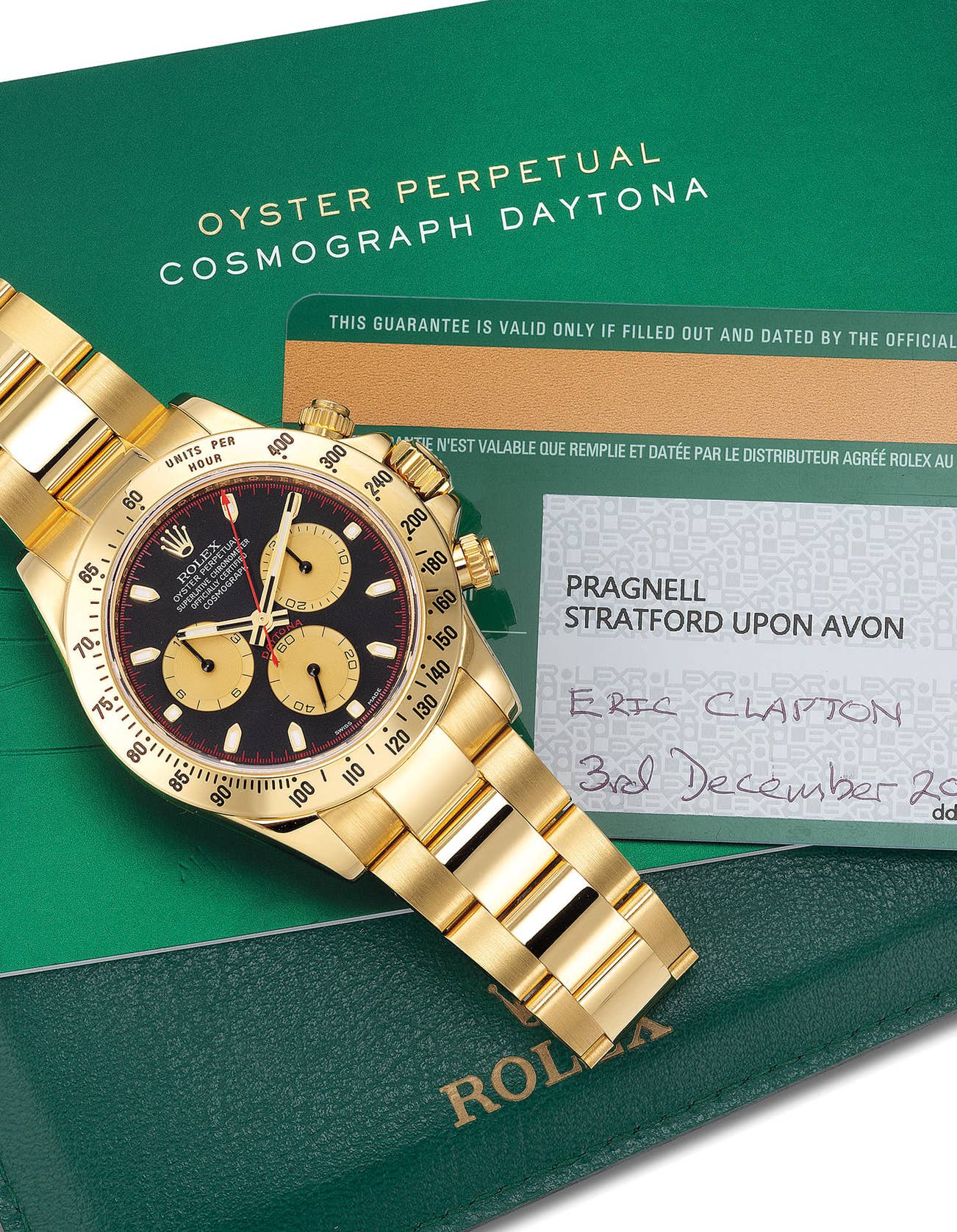 Not only this is an extremely attractive example of the reference, but must notably the watch was original sold to one of the most prominent watch collectors in the world: Eric Patrick Clapton. While the fame of Mr. Clapton is of course linked to his music - he is considered one of the best guitar players of all times - in watch collecting circles his collection is as legendary as his guitar skills, having owned some of the most remarkable modern and vintage timepieces to have appeared on the market such as, to name a few, the Patek Philippe 2499 in platinum, the Rolex Daytona 6263 Albino and a unique Patek Philippe 5016 in white gold with bracelet. As most of Mr. Clapton's modern Rolex timepieces, the guarantee card is stamped by Stratford Upon Avon retailer Pragnell.