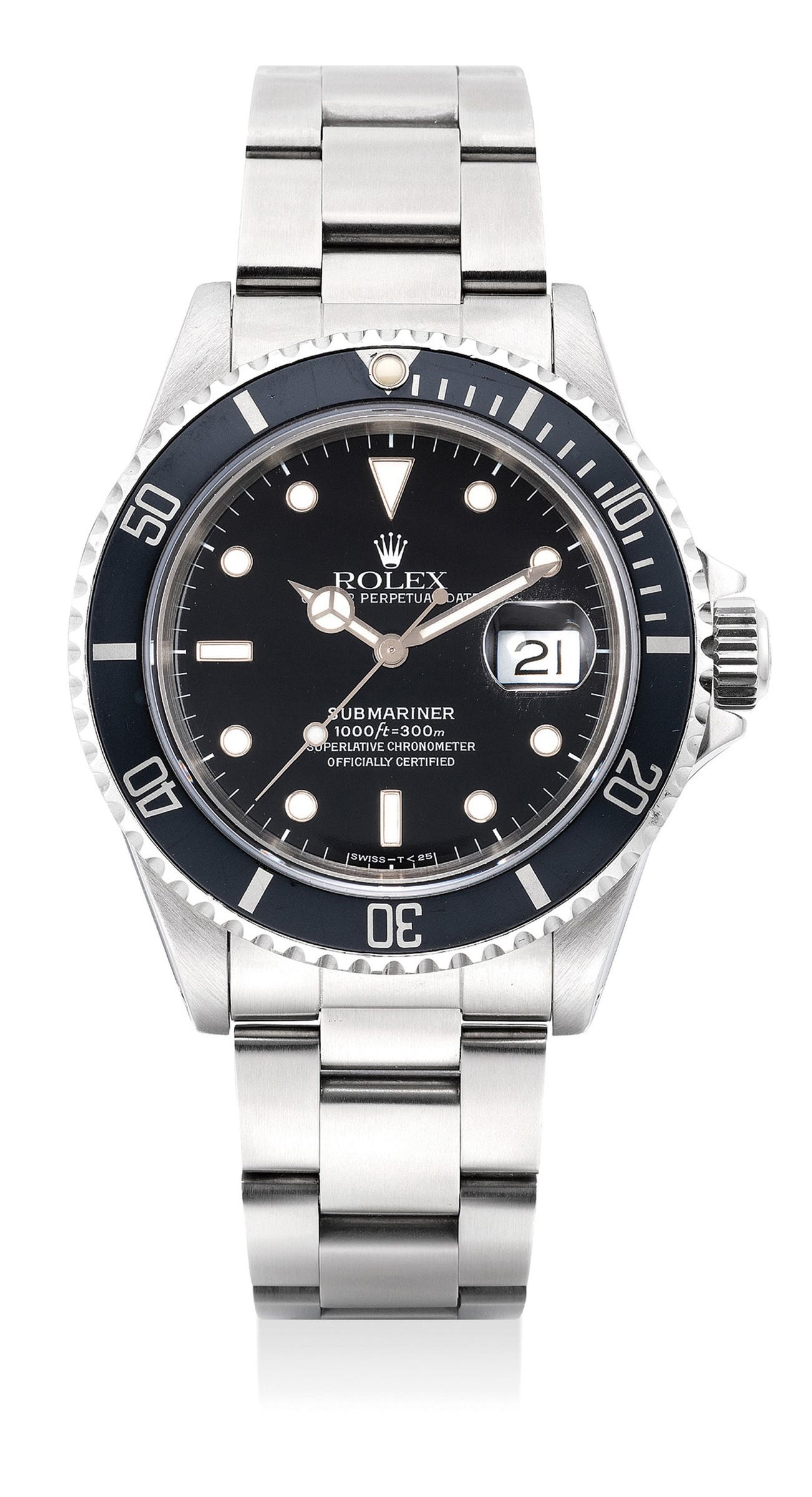 勞力士,「Submariner」型號16610,精鋼自動上弦鏈帶腕錶,配中心秒針和日期,1991年製。附保證書和配件