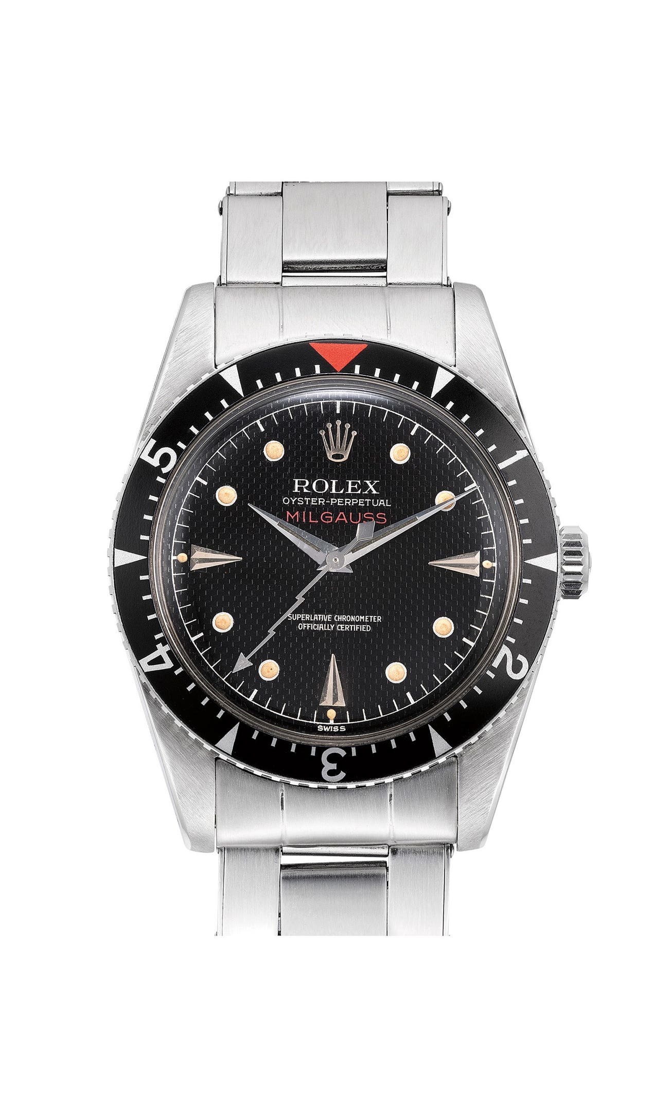 勞力士,「Milgauss」型號6541,早期﹑極度罕有及非常精細,精鋼自動上弦鏈帶腕錶,配防磁功能、黑色蜂巢紋錶盤和閃電型中心秒針,1958年製
