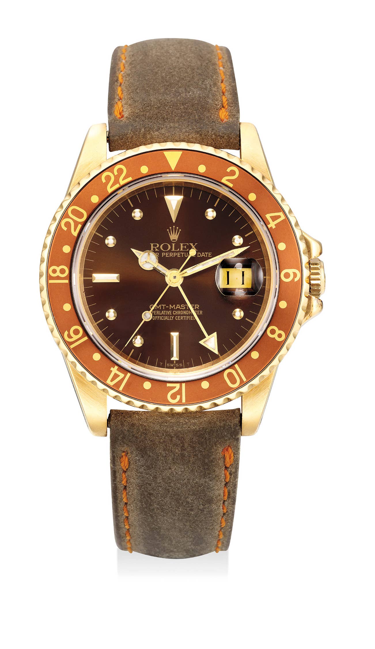 勞力士,「GMT-Master」型號16758,精細及罕有,18K黃金自動上弦鏈帶腕錶,配「Nipple Dial」錶盤﹑兩地時區﹑日期顯示和中心秒針,約1980年製