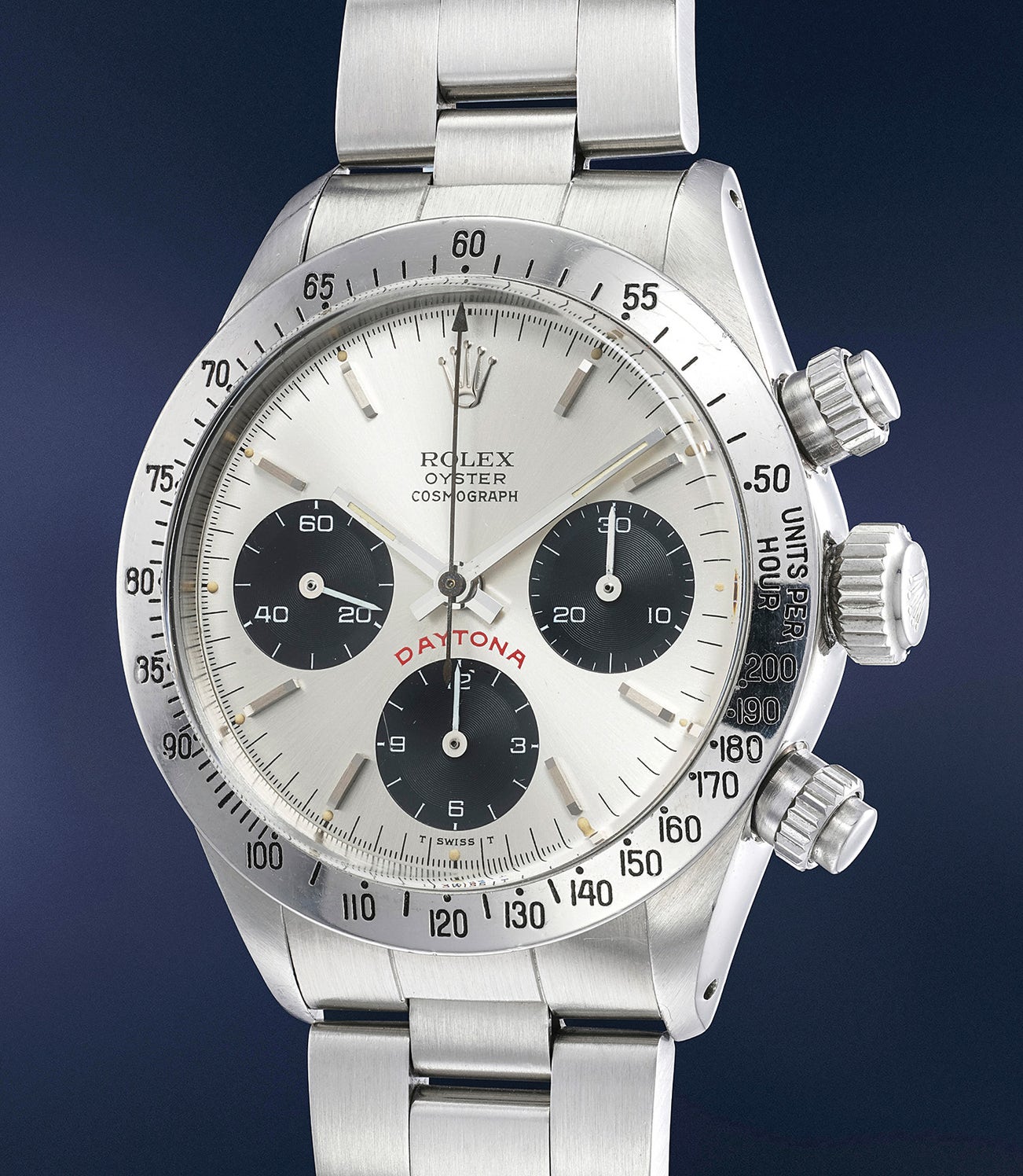 Preserved in excellent condition, the present watch is an extremely well-preserved example with crisp edges and sharp lugs. At first glance, this watch look like a well-reserved, typical Cosmograph Daytona with a "big red" dial. Further inspection of the caseback reveals more as it shows an engraving which reads "Military Forces, Officer's Barracks". Made for the Libyan army, the present watch is incredibly rare and one among a handful of known tool watches delivered with this inscription on the caseback. Most interestingly, the inside case back is repeated with the serial number, showing that the present watch was made upon special order. Furthermore, there is a small hole on the outer case back, near the "teeth". This hole was used to secure the case back when Rolex stamped the markings.