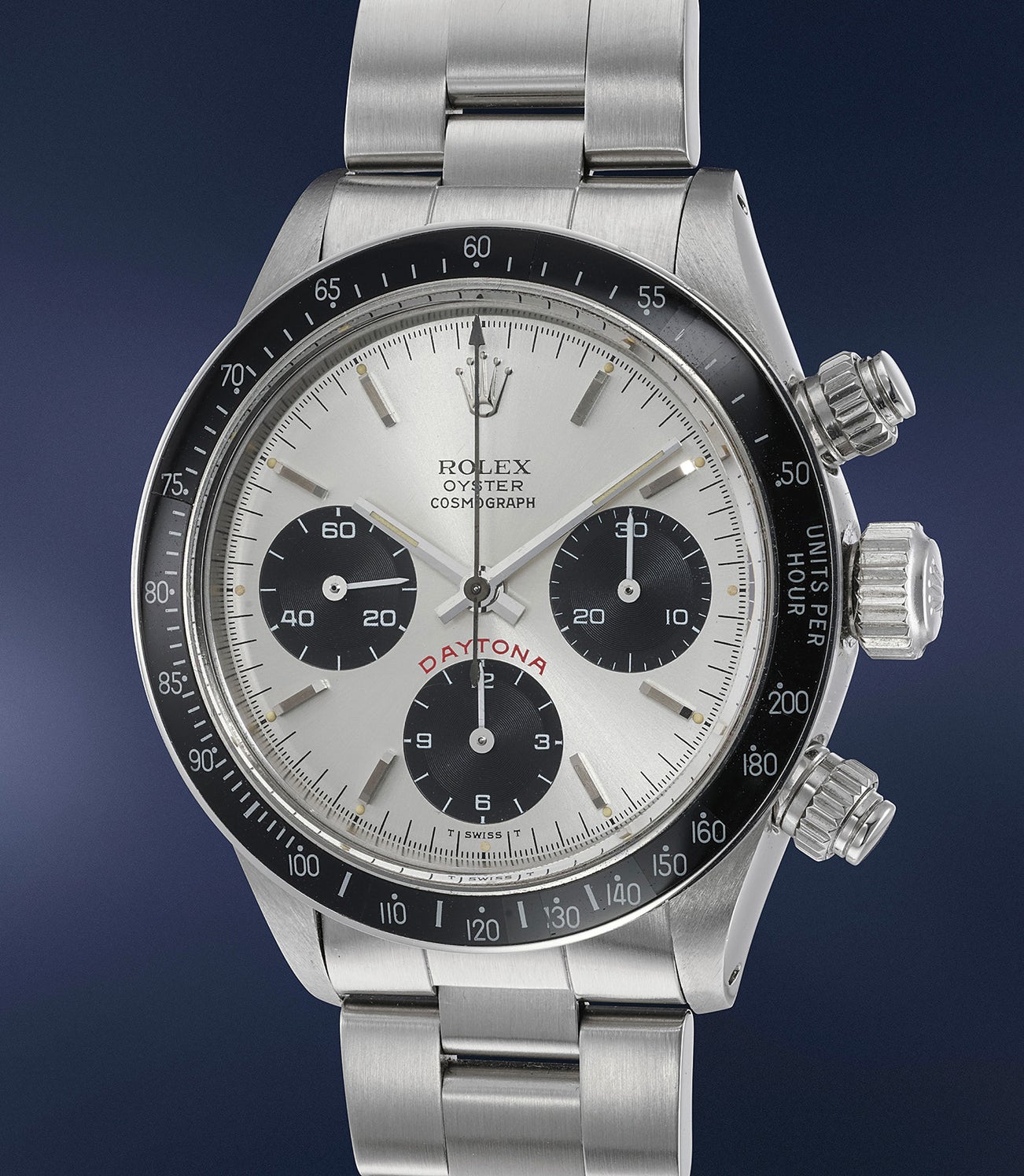 Featuring a silvered dial, the present "Big Red" Daytona is preserved in excellent condition, with sharp bevels and crisp edges throughout. The luminous material has furthermore aged with warm and pleasing patina.