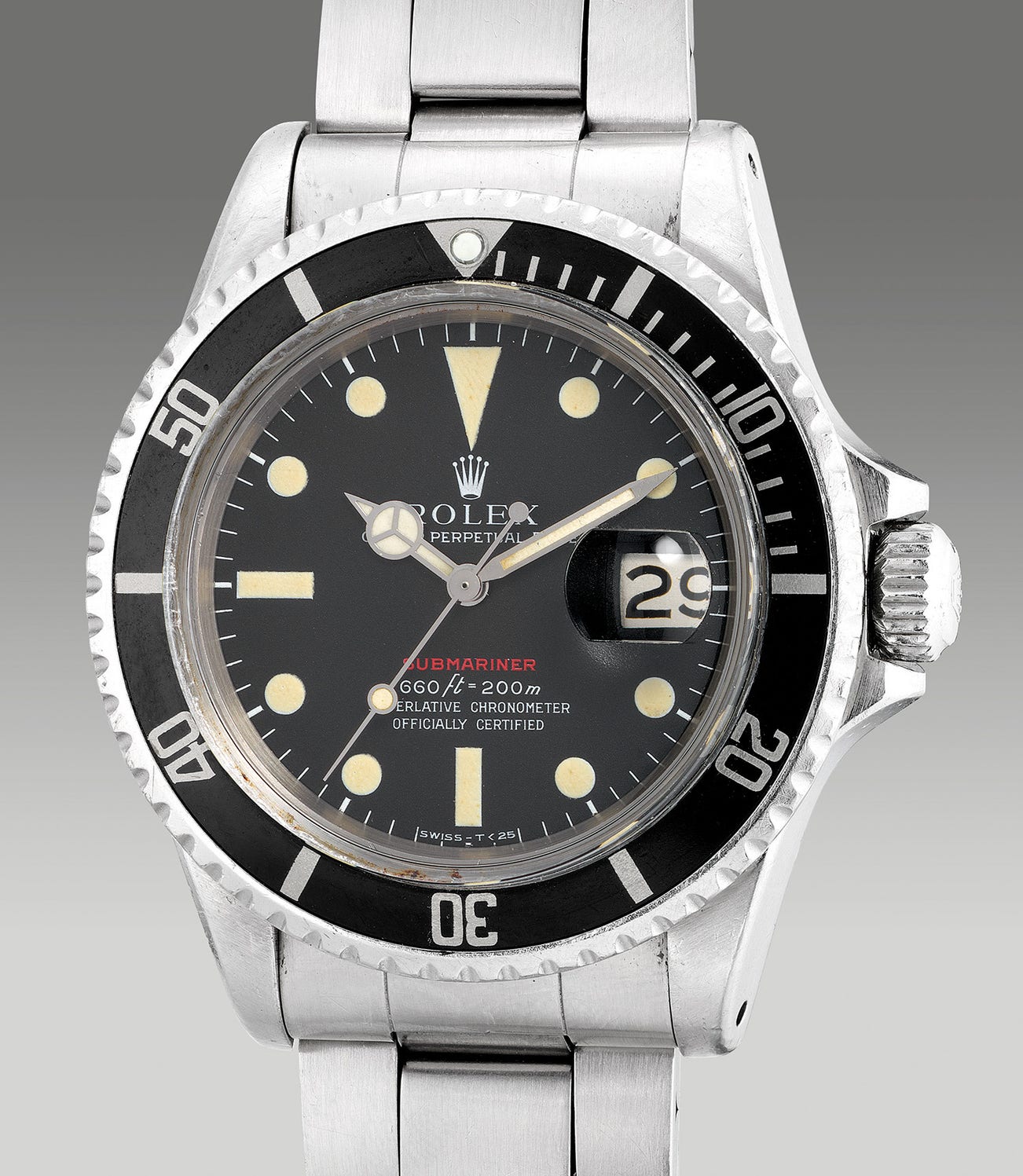 勞力士,「Submariner, Red Sub」型號1680,罕有,精鋼自動鏈帶腕錶,備中心秒針、日期顯示,約1972年製。附原裝證書、錶盒、配件