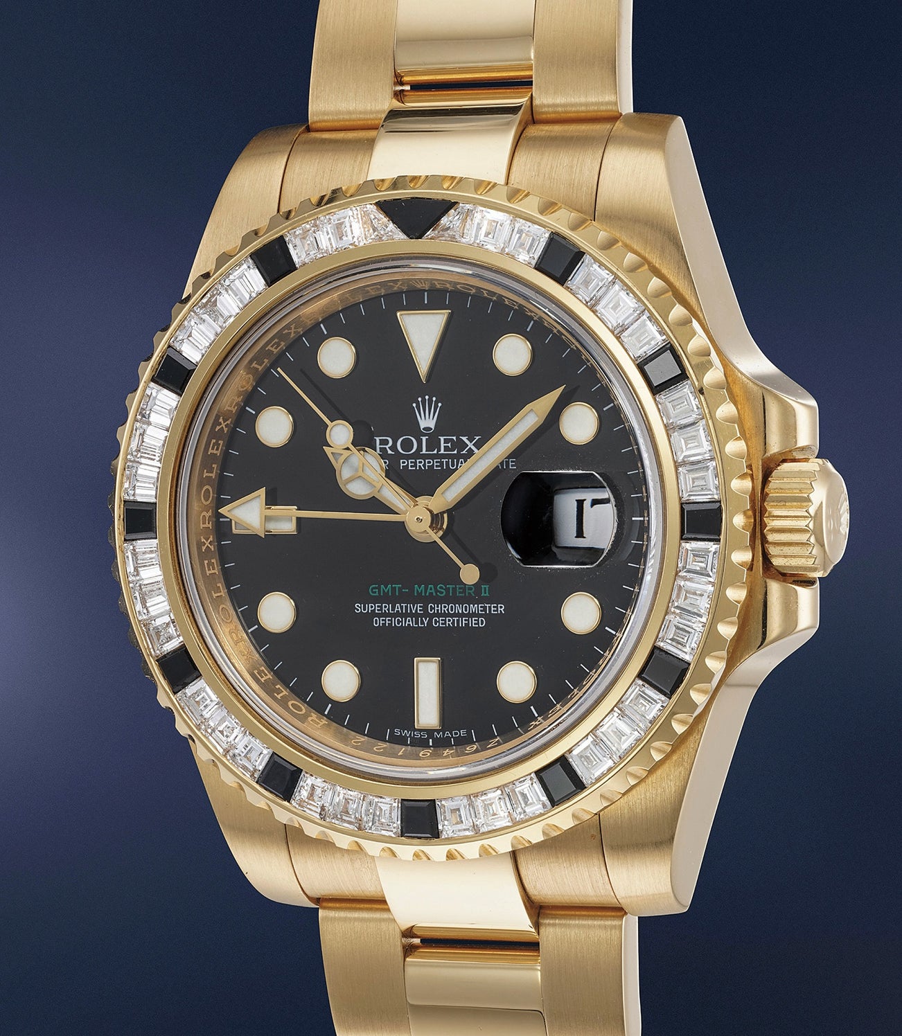 Heavy, robust and lavishly set with either a diamond-sapphire, or diamond-sapphire-ruby bezel, reference 116748 reinterprets the original SARU, providing a dressy alternative to the classic stainless steel GMT- Master II. It is important to note that very few examples of reference 116748 were fitted with the diamond-sapphire bezel, and without diamonds embellished on the lugs.