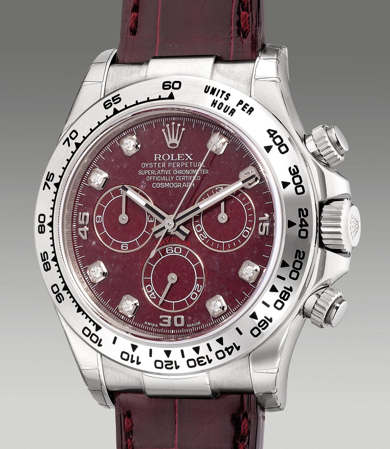 The present example Rolex Cosmograph Daytona ref. 116519 is fitted with an attractive red grossular garnet rubellite dial with diamond-set indexes. Paired with a burgundy red crocodile strap and offered in “new old stock” condition with its full factory protective stickers intact and complete with its full set of accessories, this present example can only been dubbed as the perfect specimen of this reference.
