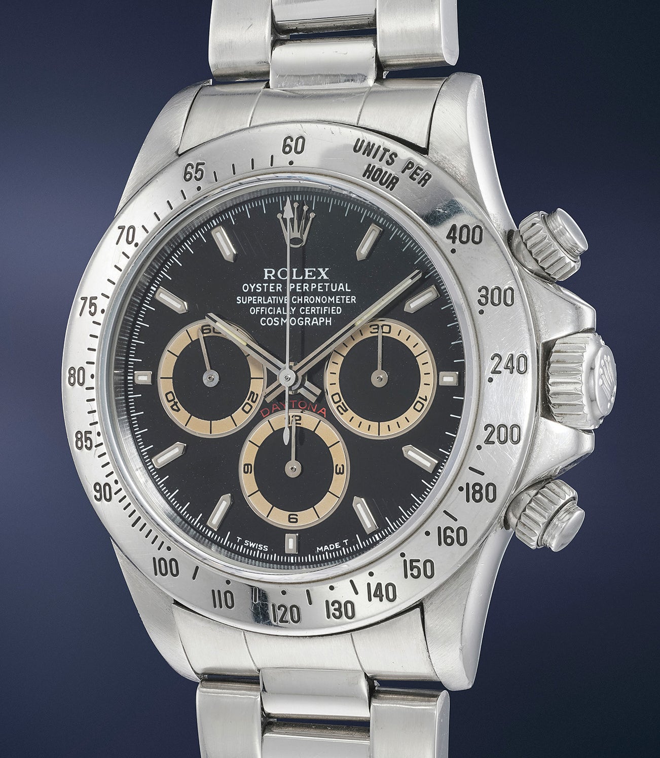 The present example is preserved in excellent condition with charismatic subsidiary registers that have turned "tropical" over time. This "tropical" effect mainly occurs on Cosmograph dials produced during the early to mid-1990s. This example furthermore retains its original guarantee stating that the watch was sold in Frankfurt - fitting, as the guarantee is stamped "100" for Germany.