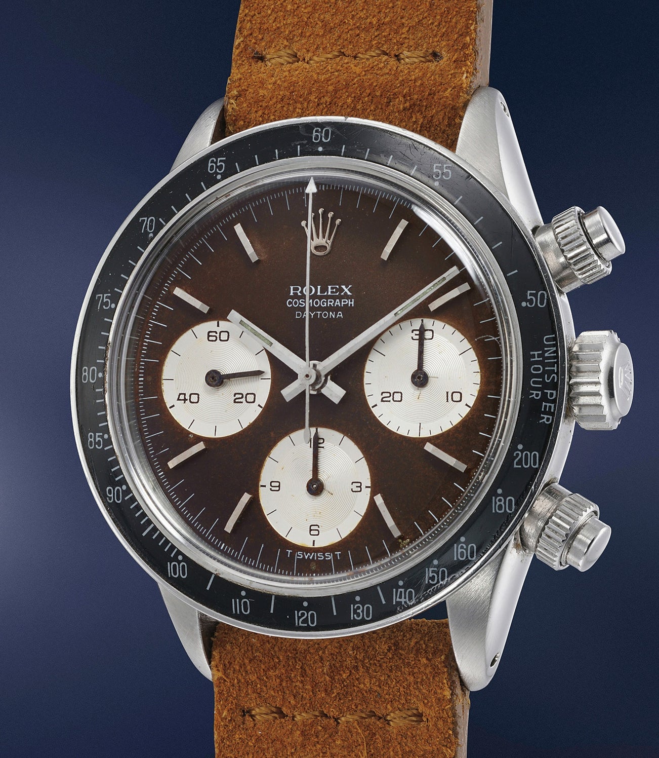This reference 6240 is yet another variant of the diverse model. Instead of bearing the ‘Oyster’ designation, the dial displays ‘Rolex Cosmograph’ with ‘Daytona’ suspended below in a smaller size. As this timepiece shares the same dial configuration with the ‘Floating Dial’ reference 6239, one can conclude that Rolex used existing dials while testing out its new and innovative ‘Oyster’ chronograph model. Furthermore, the dial has toned down from black to beautiful and rich brown "espresso" tone.