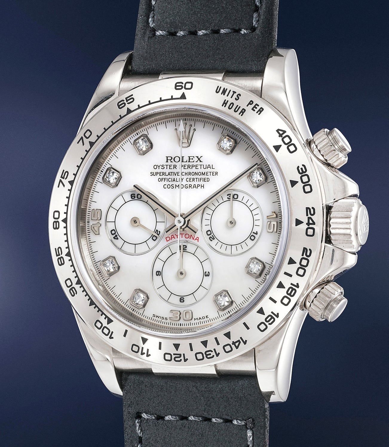 Most notably, the present watch is fitted with a Zenith-based automatic movement - among the very last of its kind when Rolex decided to switch to a in-house chronograph movement starting from the year 2000. A pre-cursor to the beloved "Beach" series, it shows how Rolex always experimented with color and design, imagining fanciful and pleasing creations.