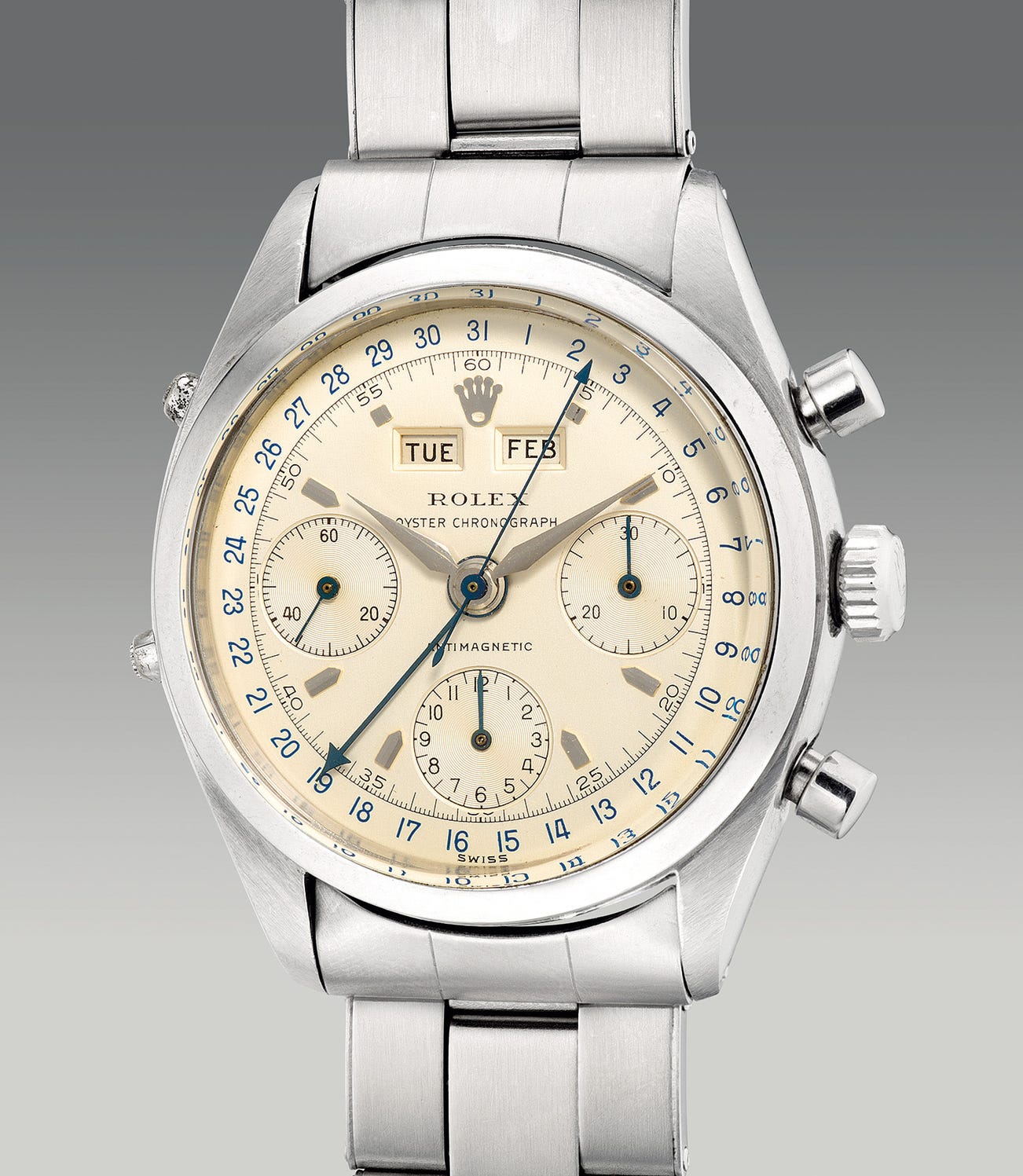 勞力士,「Oyster Chronograph, Jean-Claude Killy」型號6236,極度罕有,精鋼計時全曆鏈帶腕錶,約1960年代製