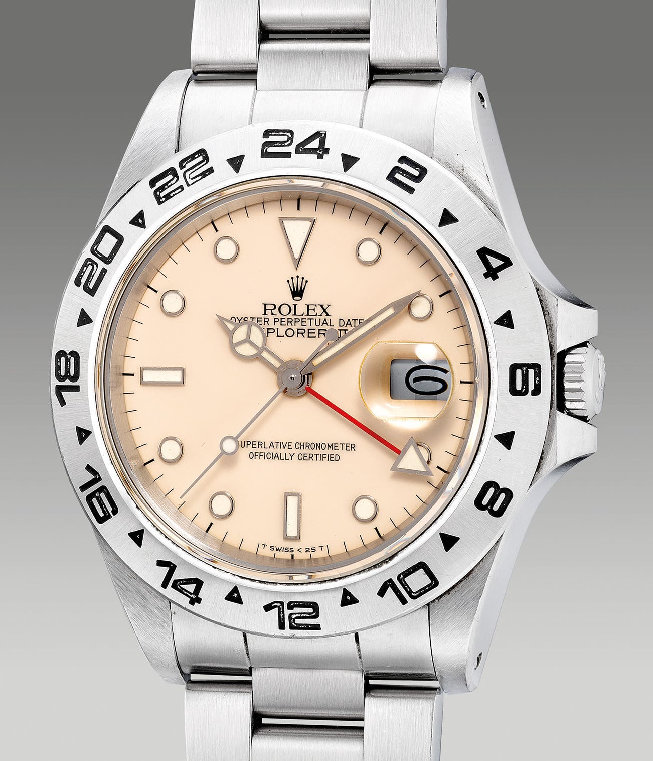 勞力士,「Explorer II」型號16550,精細罕有,精鋼自動兩地時區鏈帶腕錶,備「Creamy Pink」錶盤、日期、中心秒針、24小時顯示,約1988年製。附錶盒、原裝證書