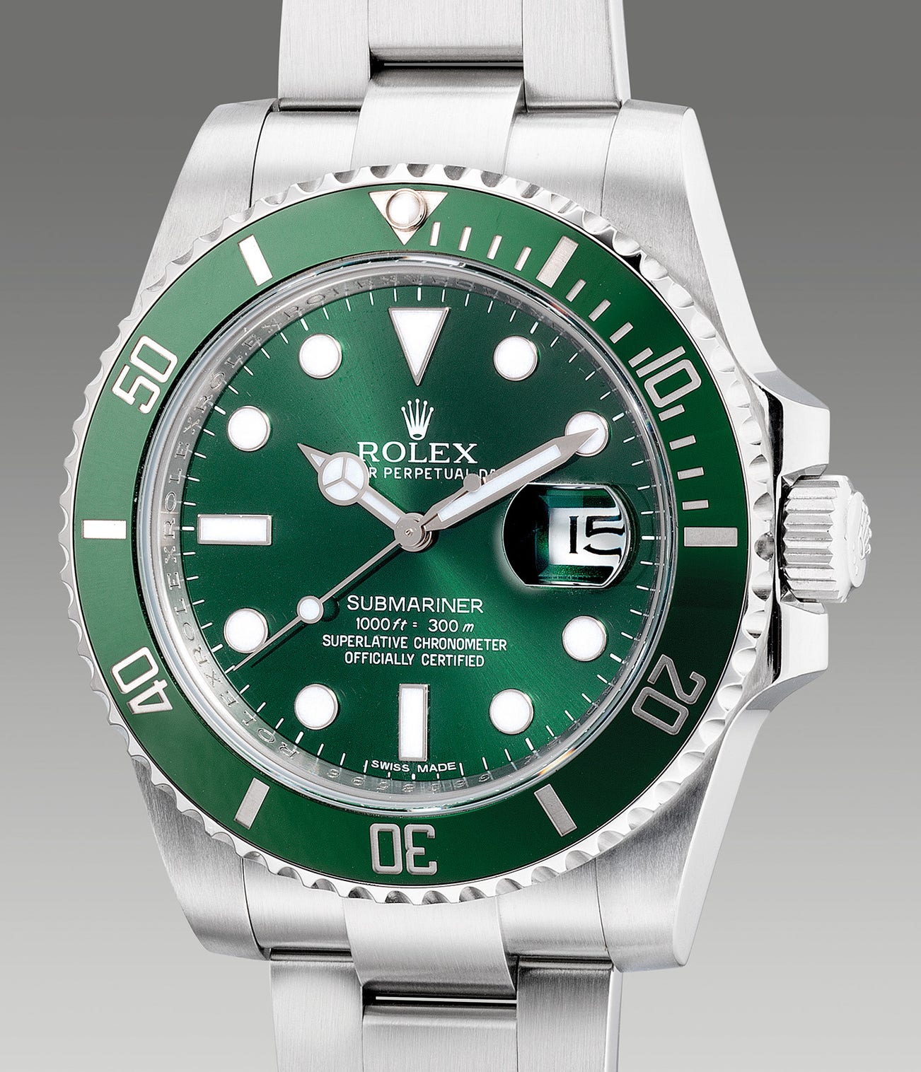 Released in 2010, the model replaced the 50th anniversary reference 16610LV, also known as the “Kermit”. While similar in overall design and build, the “Hulk” features a robust case with broader lugs and glidelock features to allow the wearer to make the necessary adjustments on the wrist with ease.