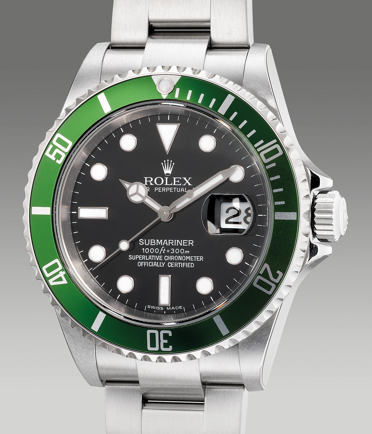 勞力士,「Submariner, Kermit」型號16610LV,精鋼自動鏈帶腕錶,備中心秒針、日期顯示,約2005年製。附原裝證書、錶盒、配件