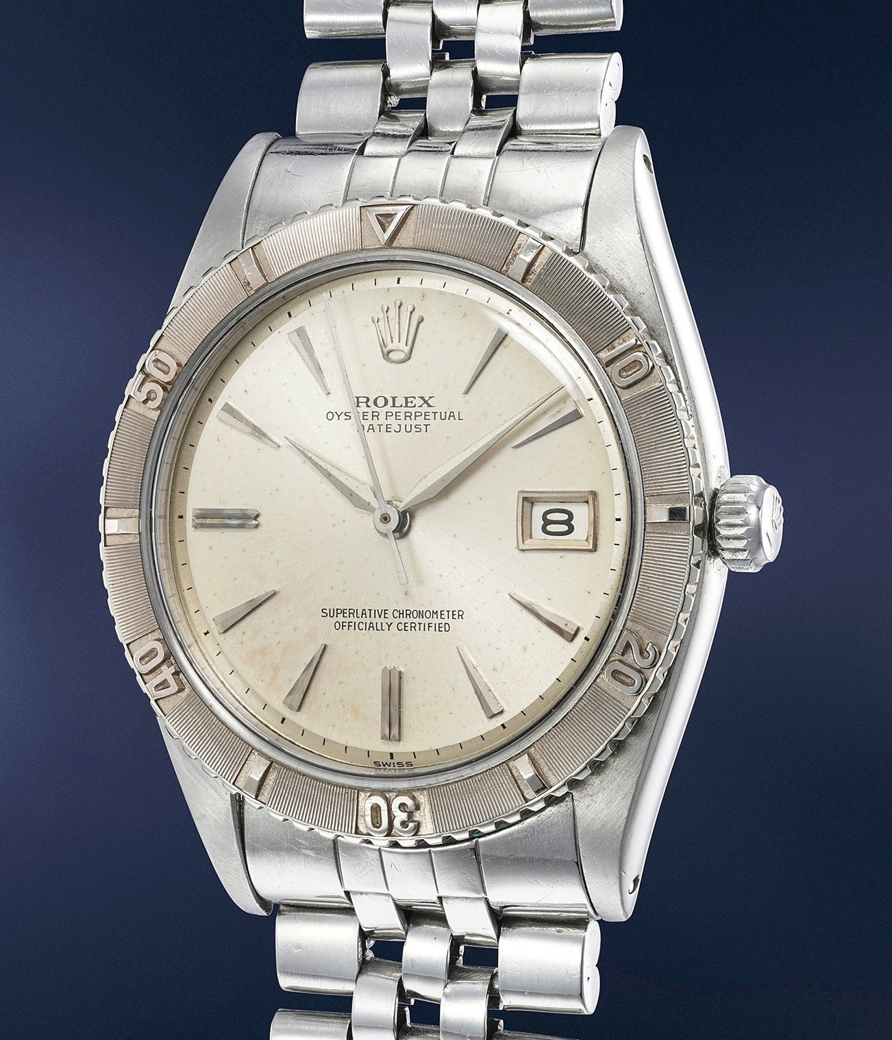 Rolex merged the ‘Turn-O-Graph’ with the ‘DateJust’ in 1954 with reference 6309. The model was advertised with images of the U.S. Air Force acrobatic flying team, or ‘Group Number 3600 of Air Demonstration’. Reference 6309 and its successors adopted the namesake ‘Thunderbird’ after the flying team’s emblem. The present watch, reference 1625, is a later reinterpretation of the original ‘Thunderbird’, featuring an updated case shape and movement caliber.