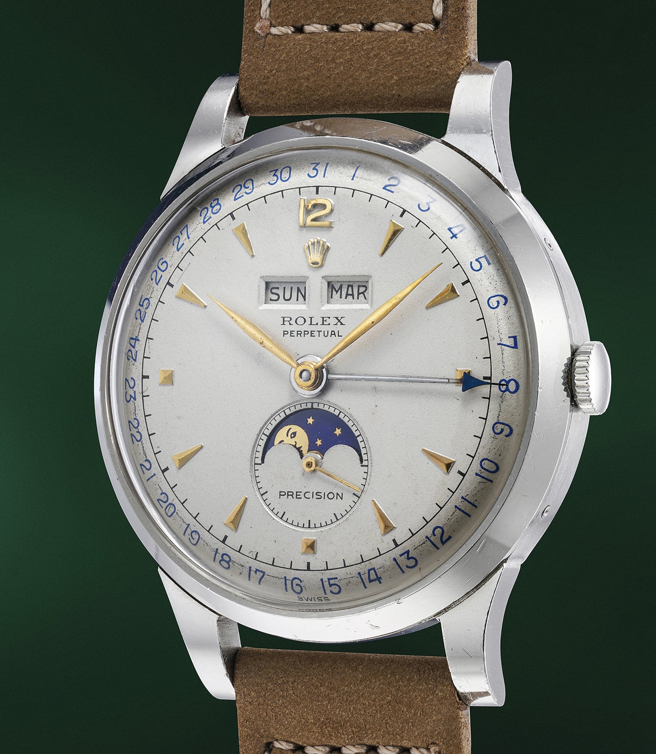 Reference 8171 has been made in three case metals, and a remarkable - given its short production run - number of dial variants are known. The present watch is fitted with the beloved grené dial. The dial is preserved in charming and unrestored condition, with sharp and crisp apertures at 12 o'clock attesting to its originality. Most reference 8171s have undergone some restoration during their lifetime, yet this example remains untouched to this day, further enhancing its desirability and rarity. The dial construction - which itself resembles an upside down frying pan - grants the dial a subtle two-tone effect: while the finish is the same on the entirety of the dial, the sloped outer track reflects light differently than the flat center, thus creating the illusion of two-tone finishing; this small and charming detail highlights the care which Rolex imbues their designs with.