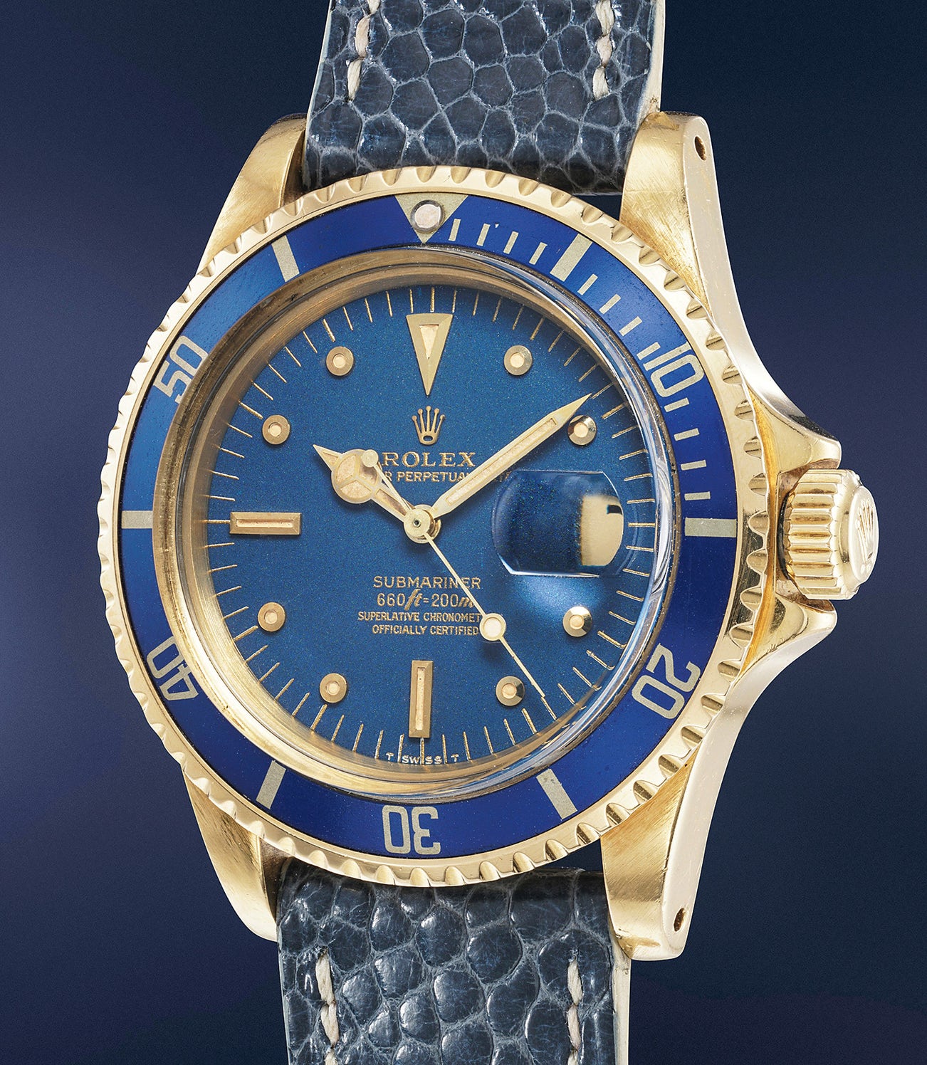 The present watch is preserved in excellent condition, with crisp hallmarks beneath the lugs. What is most striking is the special matte blue dial, which to the best of our knowledge, has never appeared on a yellow gold Submariner before. It is a hybrid between the commonly found black matte dial and blue soleil dial - one can only conclude that it was a test dial used in the 1970s to broaden Rolex's catalog, during a time when the manufacture was (and continues to) pushing boundaries. The blue dial is preserved in excellent condition, and the luminous material has aged evenly with the hands. As an even nicer touch, it's accompanied by a matching blue Attila Aszodi lizard strap.