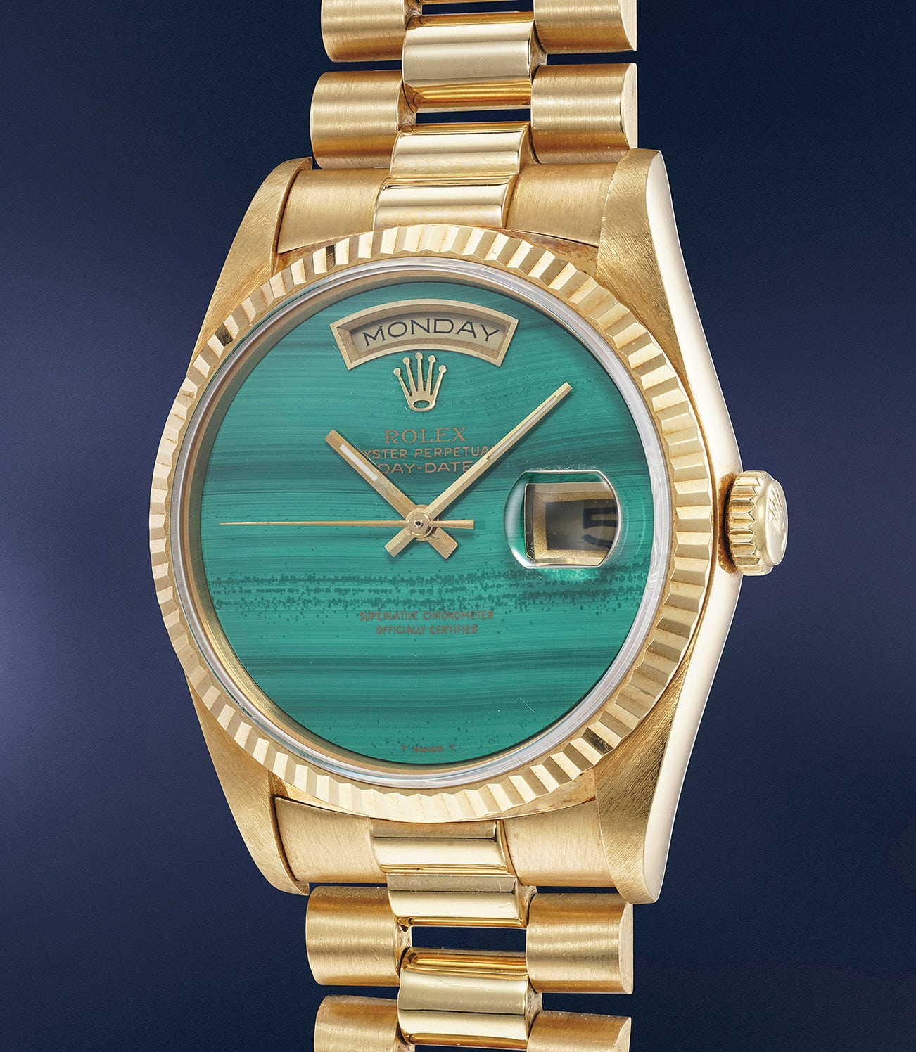 A highly rare and attractive yellow gold calendar wristwatch with center seconds, malachite dial and bracelet