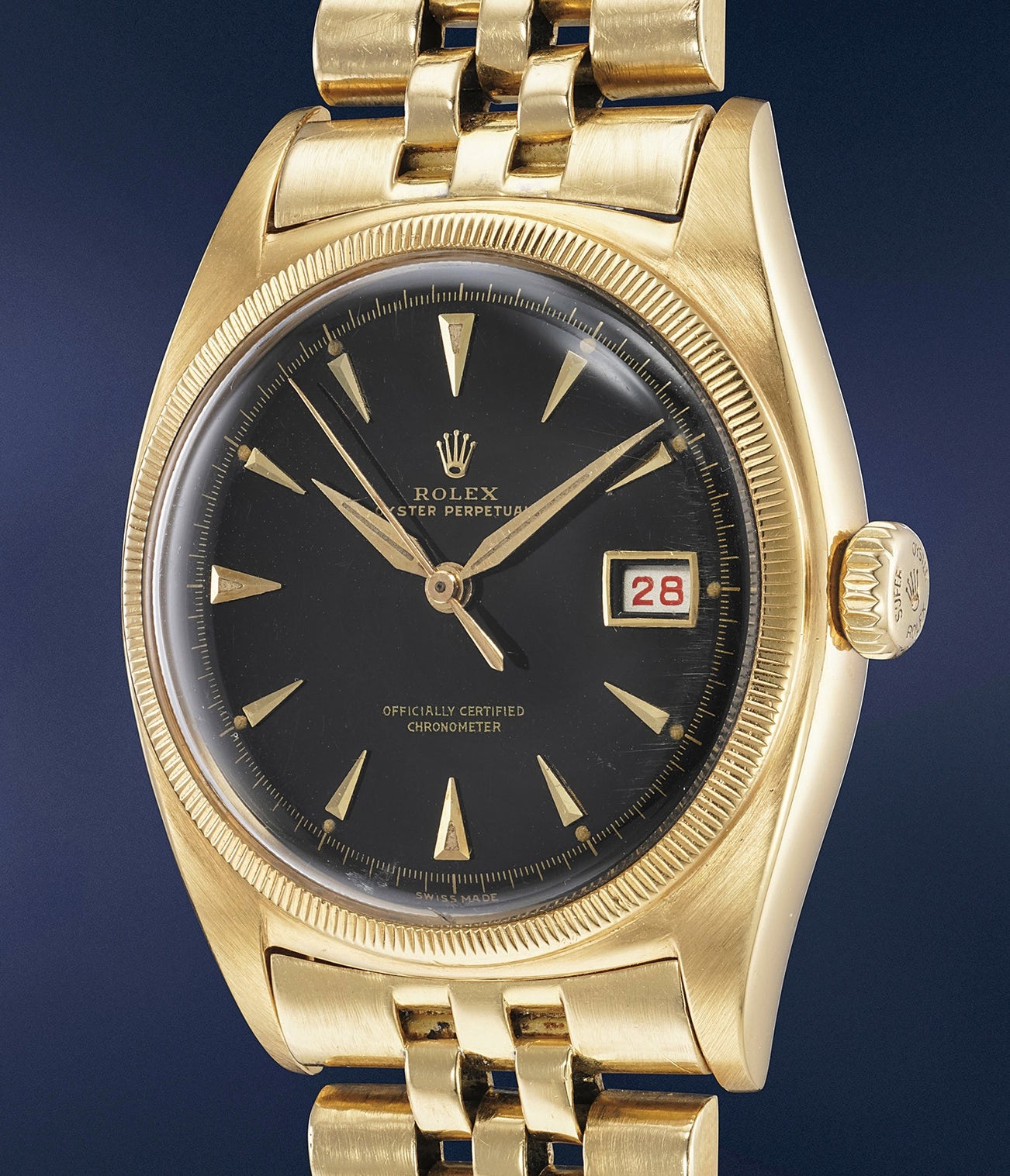 The present example is distinguished by its extremely attractive black luminous dial, extremely well preserved, and the enormously charming Jubilee bracelet - stamped 2 51: perfectly matching the production year of the watch. In fact, this example appears to be one of the earliest representatives of the model. An interest detail about the reference is that while it was present in catalogue with the current ribbed bezel, a version with smooth bezel was also available for purchase.