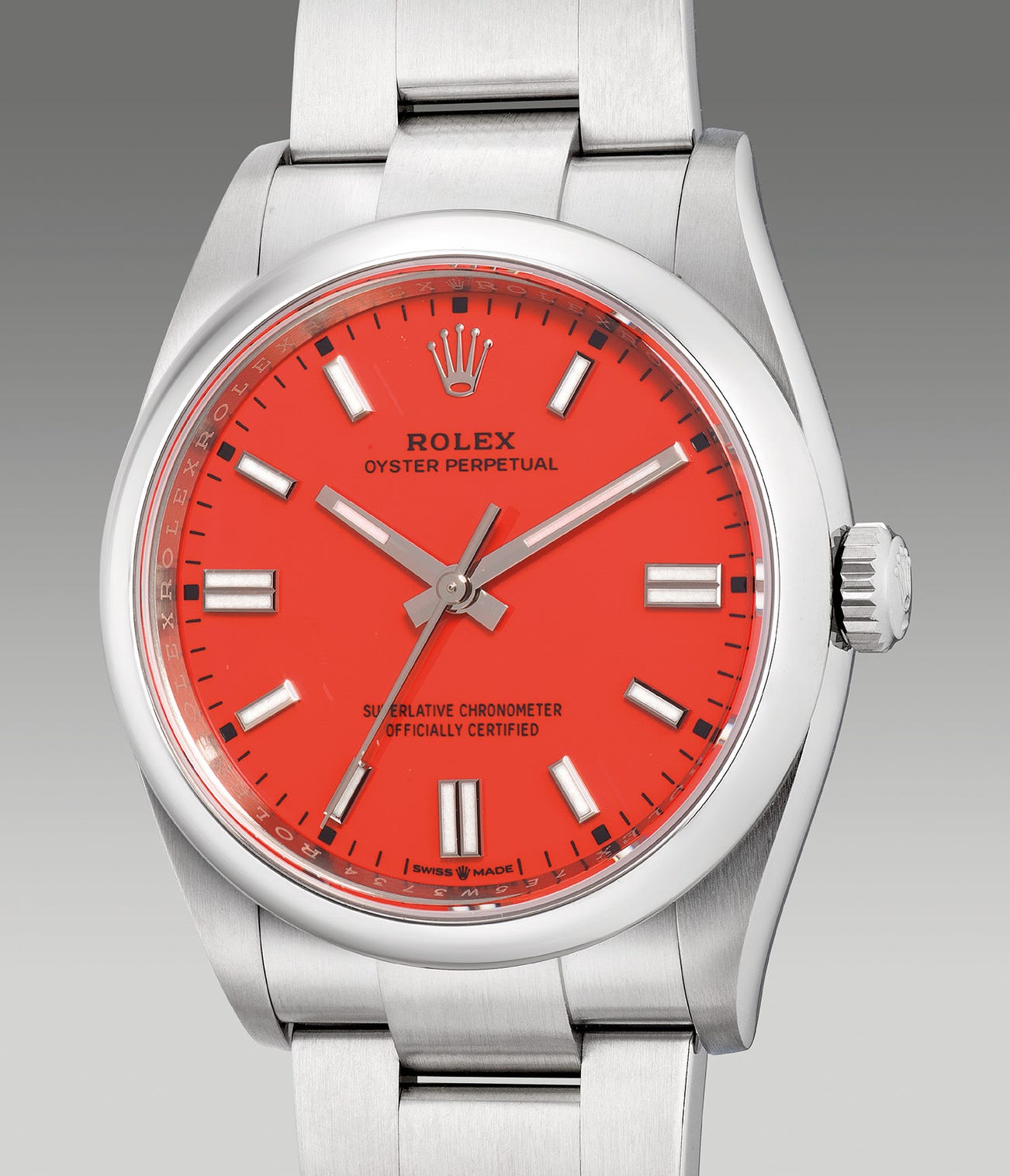 勞力士,「Oyster Perpetual 36」型號126000,精細,精鋼自動鏈帶腕錶,備珊瑚紅色漆面錶盤,約2020年製。附原裝證書、錶盒