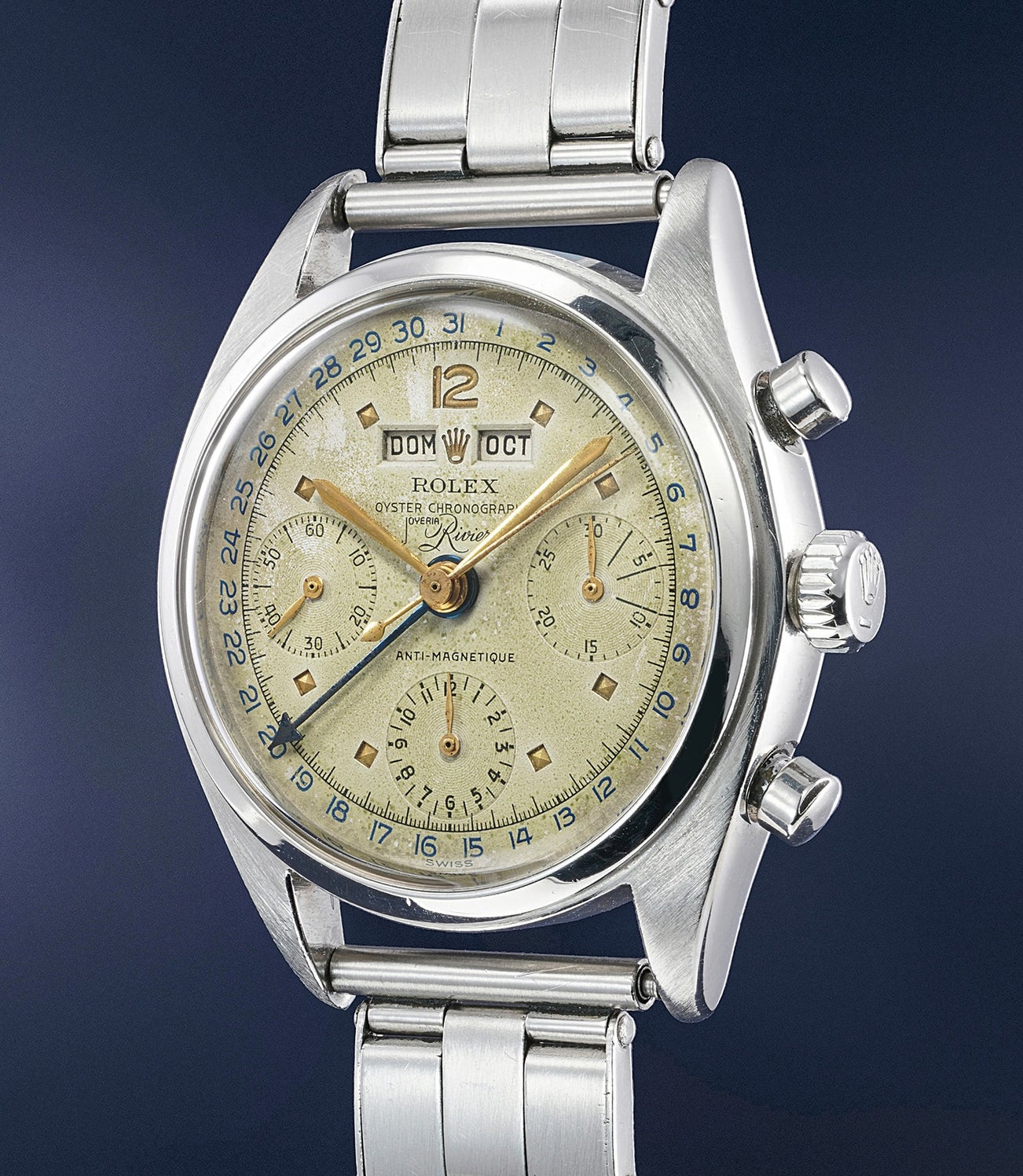 Since its birth, the dial was immediately in a category of its own as it is the only example known of 6036 co-signed by Joyeria Riviera. Furthermore, the signature of the Cuban (before moving to Puerto Rico for political reasons) retailer is unarguably one of the most aesthetically complex and pleasing, defined by the large cursive “R” and also - in juxtaposition - by the very long and linear J at the beginning.
