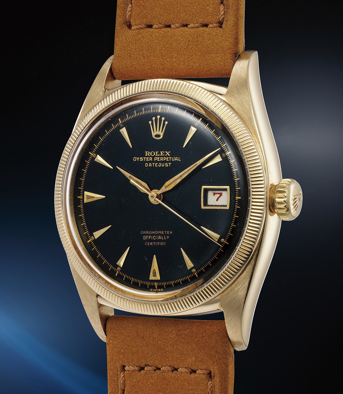 Preserved in excellent condition, this yellow gold Datejust displays crisp finishes on the top of the lugs, as well as a sharp hallmark beneath the lug. This timepiece even retains its original Super Oyster crown.