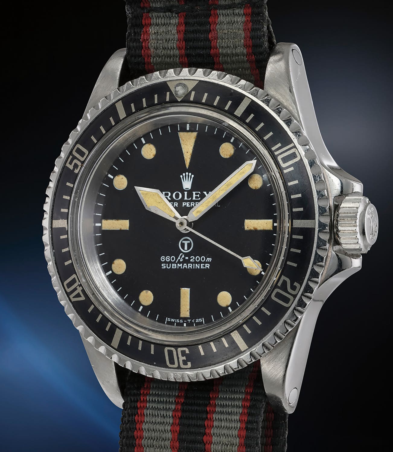 Instead of designing a new model, Rolex modified the current timepieces to meet the standards set down by the British Ministry of Defense. They are now known as "MilSub." For improved readability, "MilSubs" have large sword-shaped hands and a dial with a ringed "T" denoting the usage of luminous tritium. A spinning bezel insert calibrated for 60 minutes, rather than the ordinary 15-minute calibrated bezel, was another peculiarity. To avoid the fitting from failing, the military demanded a hack (stop seconds) function as well as permanent, fixed spring bars soldered to the lugs. The caseback engravings on the military and civilian versions are also distinct, with the current lot bearing the "0552" code for the British Royal Navy and "923-7697" for NATO followed by the issue number, "801", and year of issue, "72". The inside caseback on this watch is repeated with the last 3 digits of the serial number, which is correct for a special order watch.