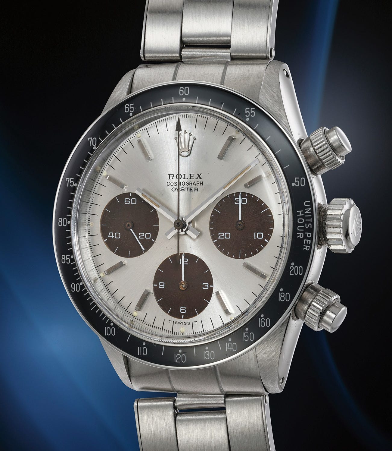 One of the earliest examples of the reference, the dial displays “Rolex Cosmograph Oyster”, acknowledging the new and innovative water resistant screw-down pushers. This concept is forerunner to the better-known “Oyster Sotto Paul Newman” as both variants feature the word “Oyster” below “Rolex Cosmograph” turning the typical dial layout upside down. Scholars believe that Rolex was experimenting with different dial layouts before they decided to definitively print "Rolex Cosmograph Oyster". Exceedingly rare, research shows that a handful of these watches are known. Furthermore, the registers have turned a beautiful chestnut "tropical" tone.