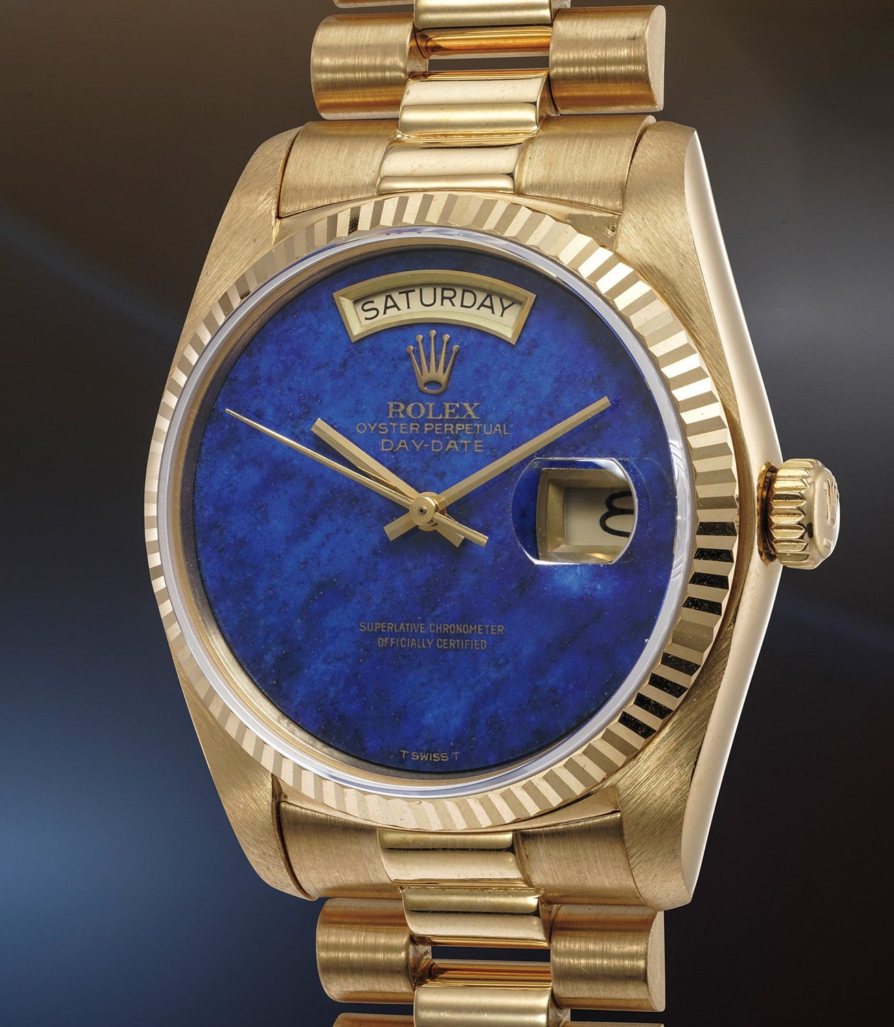 This rare variant of reference 18038 is fitted with a beautiful lapis lazuli dial that is preserved in excellent condition with no cracks or fissures. All crisp hallmarks are present on the caseback, further underscoring its condition and rarity. Furthermore, it is accompanied by its guarantee and numbered hang tag, providing another element of collectibility.