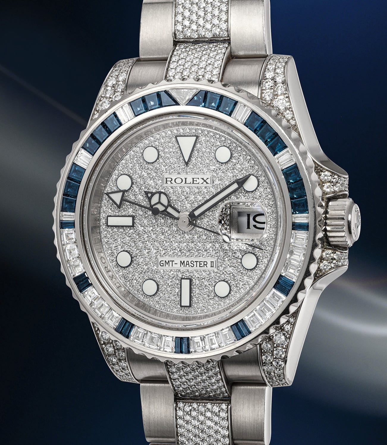 Heavy, robust and lavishly set with either a diamond-sapphire, or diamond-sapphire-ruby bezel, reference 116759SA (without rubies) reinterprets the original SARU with a white gold case, providing a dressy alternative to the classic stainless steel GMT- Master II. This example is one of the most prestigious versions and is set with a pavé dial, sapphires and diamonds on the bezel, along with diamonds set on the center links.