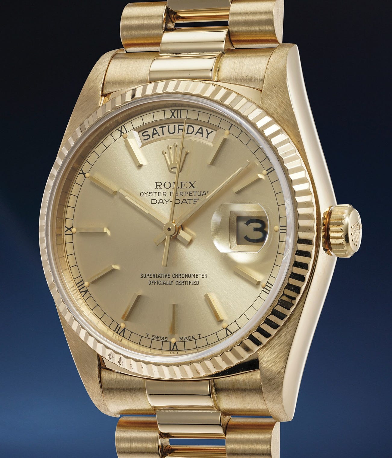This rare variant of reference 18238 is fitted with a beautiful champagne dial. Preserved in excellent condition, all crisp hallmarks are present on the caseback, further underscoring its condition and rarity. Furthermore, it is even accompanied by its original box and Rolex notepad, adding another layer of collectibility.