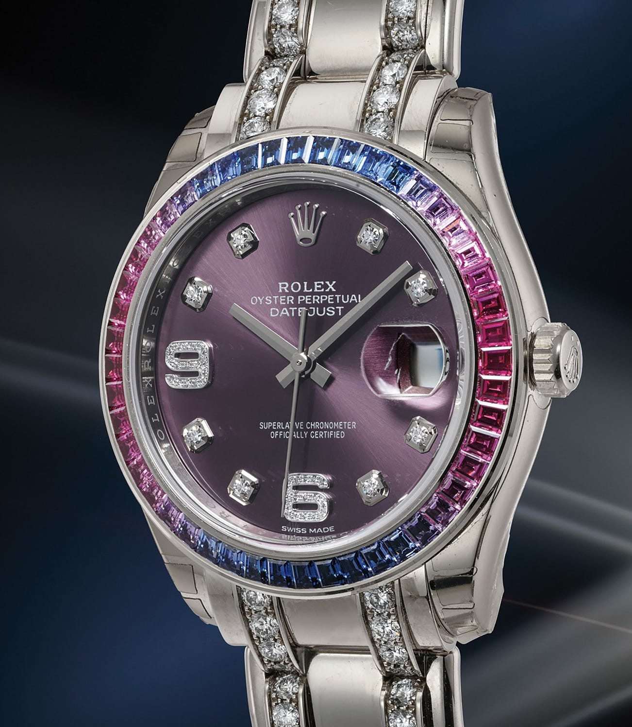 Dazzling and impressive, the present Datejust Pearlmaster is an extremely rare and exquisite example of the exceptional craftsmanship and quality Rolex demands for these fascinating works of art. The brand’s watchmakers spend an enormous amount of time color matching each stone so the gradient color effects seen with the bezel’s sapphire stones is as precise as the timekeeping ability of the watch. The aesthetic is enhanced by the bezel set with blue and fuchsia sapphires that gives the watch a casual appeal, making it perfect for the office, a casual weekend outing, or a formal cocktail event.