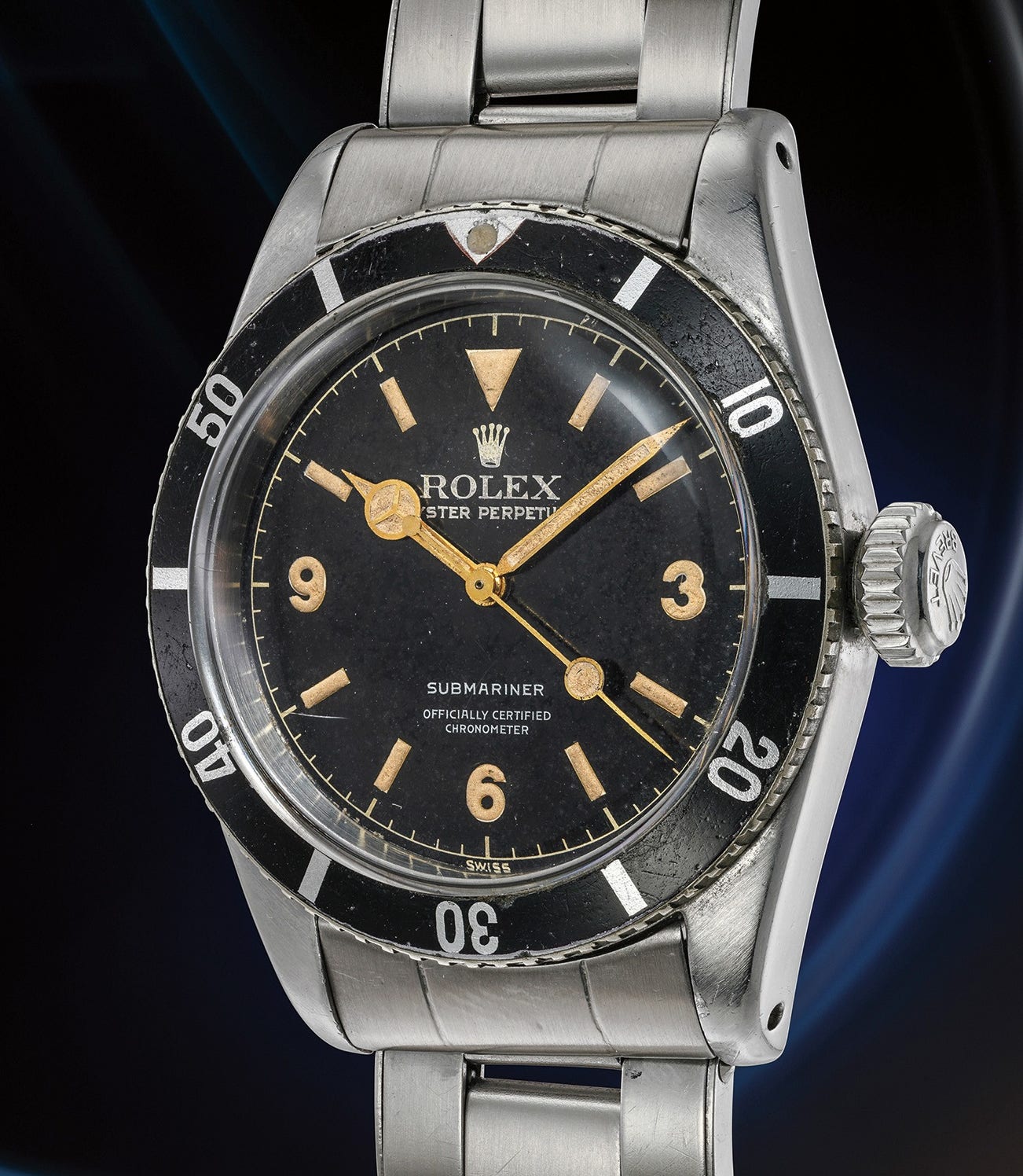 Displaying thick bevels and incredible proportions, this Submariner displays a very impressive case. It retains its original Brevet crown. Furthermore, the dial is preserved in extremely attractive condition with barely any losses to the luminous material, which has aged evenly to a beautiful warm hue. The dial has not been altered throughout its life (which is a marvel in itself as many existing examples today have been "touched up" at least once during its lifespan), and the gilt graphics shine through beautifully.