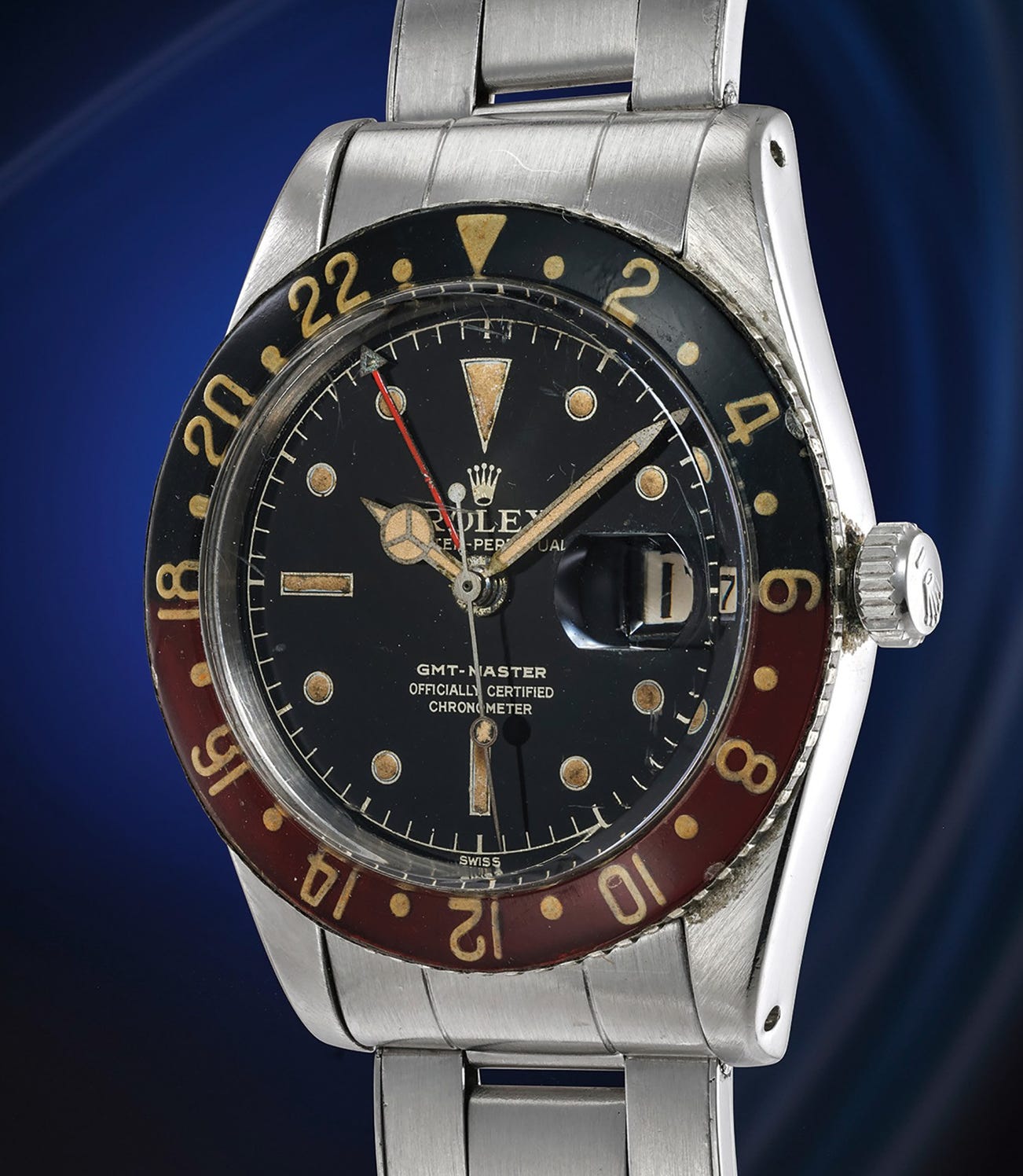 First released in in 1954, the GMT-Master reference 6542 was designed for pilots to use in their line of work. With the rise of international travel in the 1940s and 1950s, Rolex initially created the model for Pan Am airlines to track dual time zones. This ingenious design featured an immediately recognizable bakelite bezel with the twenty-four hour numerals painted on the underside, made to glow in any weather condition. Bakelite was Rolex's original material of choice, due to its low reflectivity and high readability. The additional luminous 24 hour tipped hand allowed the viewer to immediately track a second time zone.