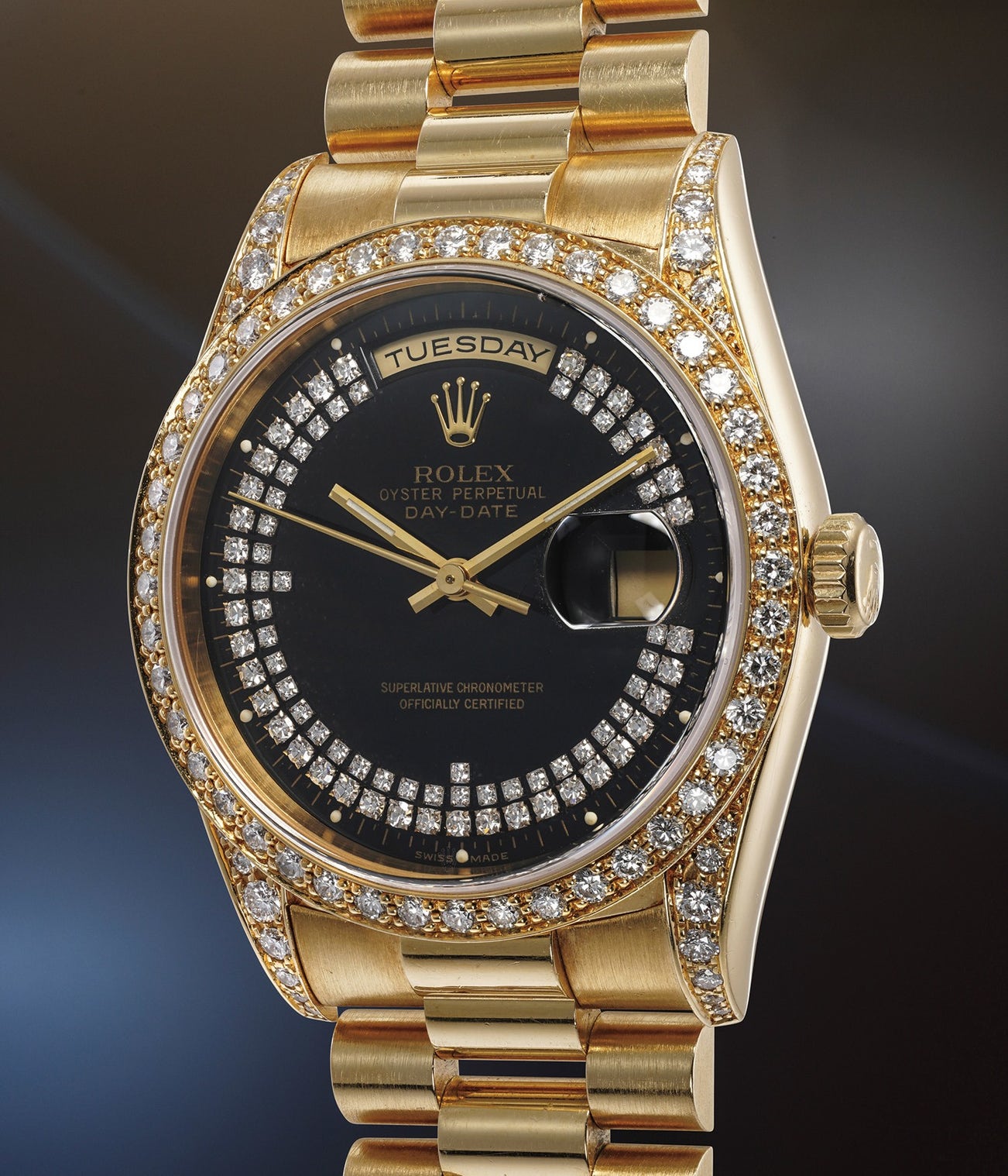 Reference 18388 most notably displays a diamond bezel. Fitted with a beautiful black dial, brilliant diamonds are also studded on the dial. Beautiful and lavish, it showcases Rolex's creativity in designing some of the most unusual Day-Dates of the past half century.