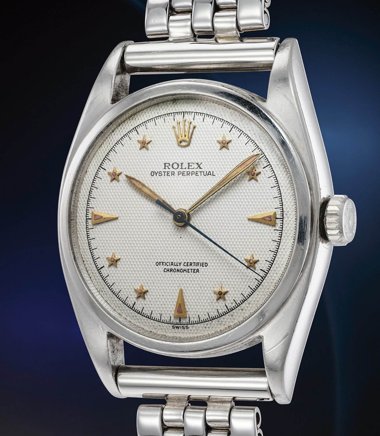 Among those produced, one of the most exclusive and desirable variants of the time-only wristwatch featured a dial with eight faceted stars in lieu of numerals, such as the present watch. While black dial examples are known as the "Galaxy" from advertising of the period, this model recalls the configuration of the famous "Stelline" reference 6062 by the Bao Dai. The present version with ivory white dial is preserved in excellent and impressive condition with hardly any sings of aging. The luminous dots and hands have aged similarly together and now display warm patina.