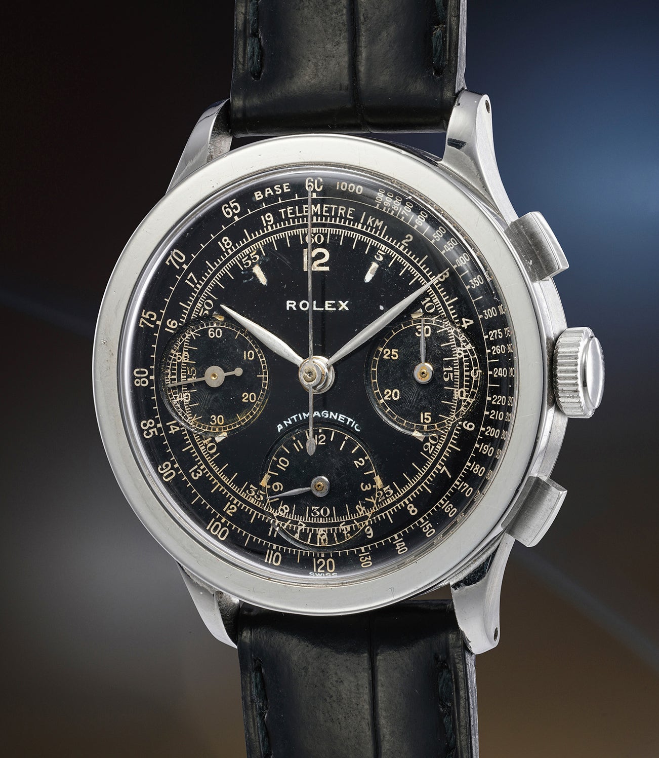 The present example elevates the desirability of the model thanks to its black dial, a feature that will appeal both scholarly-inclined collectors - thanks to its rarity - as well as the more aesthetics-devoted ones - thanks to the enormous charm and character the black dial grants to the ensemble.