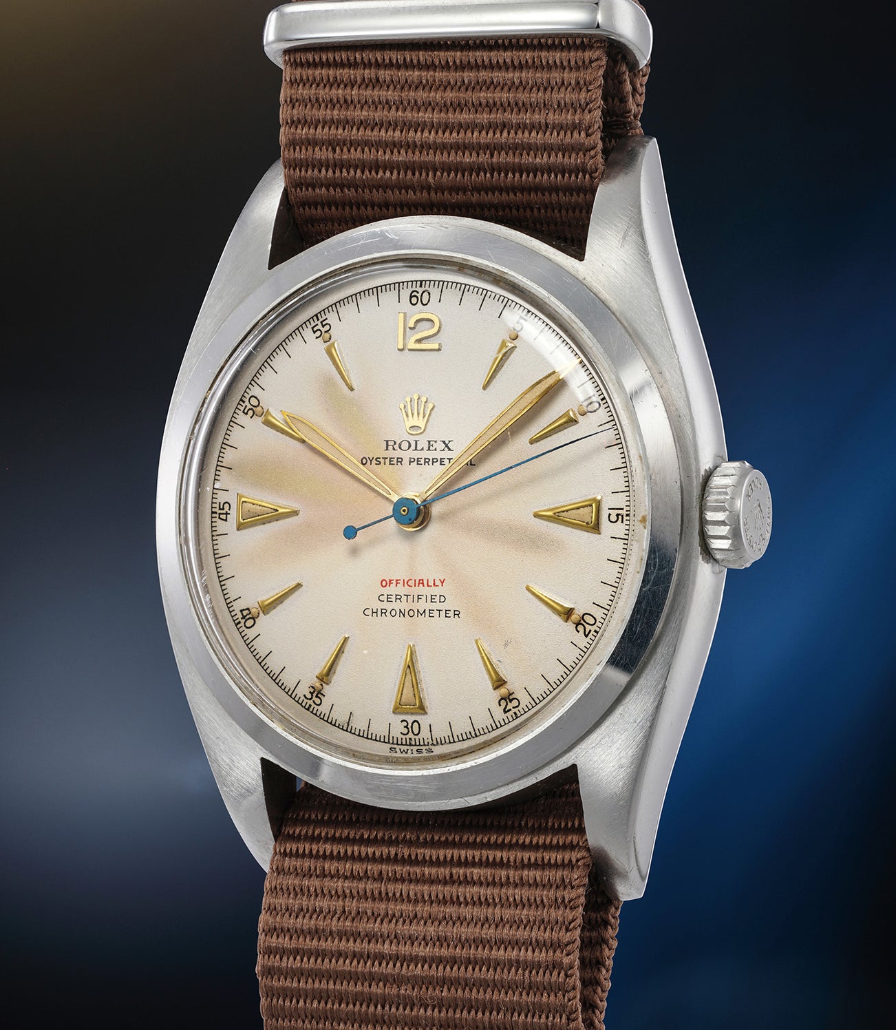 The dial features a closed minute track, applied arrow hour markers, and applied Rolex coronet at 12 o’clock. Exulting a vintage je-ne-sais-quoi, the dagger hour markers, triangular indexes inlayed with radium and the lume plots have developed a warm creamy patina and remain perfectly plump and intact. Yet, what immediately draws one’s attention is the beautifully aged “sun ray flower” patina that developed on the dial over the years following the movement of the leaf shaped hands resting at different position. This further indicates that the watch was seldom used throughout its entire life.