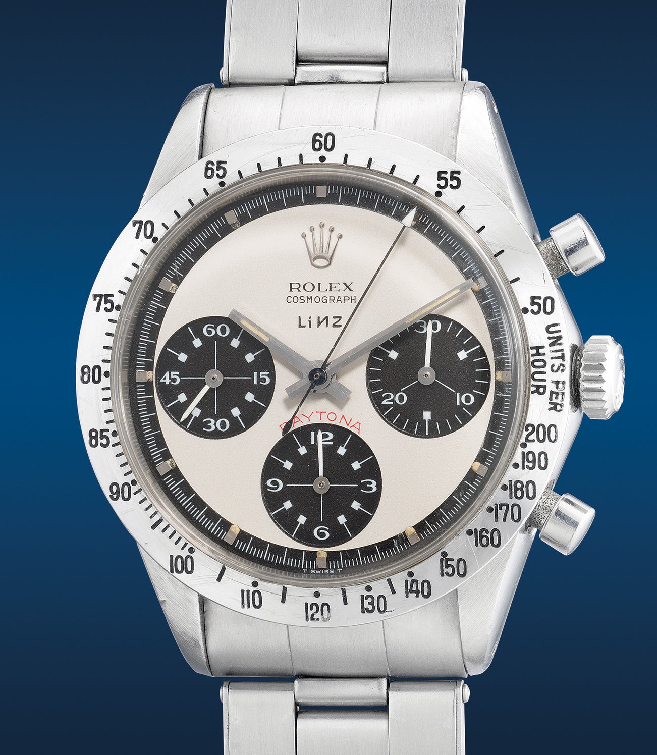 The present example ref. 6262 from circa 1970 with a 2.3 million serial displays an attractive “Panda” non-oyster Paul Newman dial that features the rare and highly desirable Linz signature printed below “COSMOGRAPH”. Fresh-to-the-market, the present example is a rare find that has never been offered to the public before making this a truly momentous event for the vintage watch collecting community. Extremely attractive, the dial has been preserved in excellent overall condition with a clean surface and uninterrupted luminous plots. To further enhance the originality of the timepiece it features all the correct components such as the original Twinlock 600 crown and pump pushers as well as a riveted Rolex Oyster bracelet with its clasp stamped “ROLEX USA” and “I-71”.