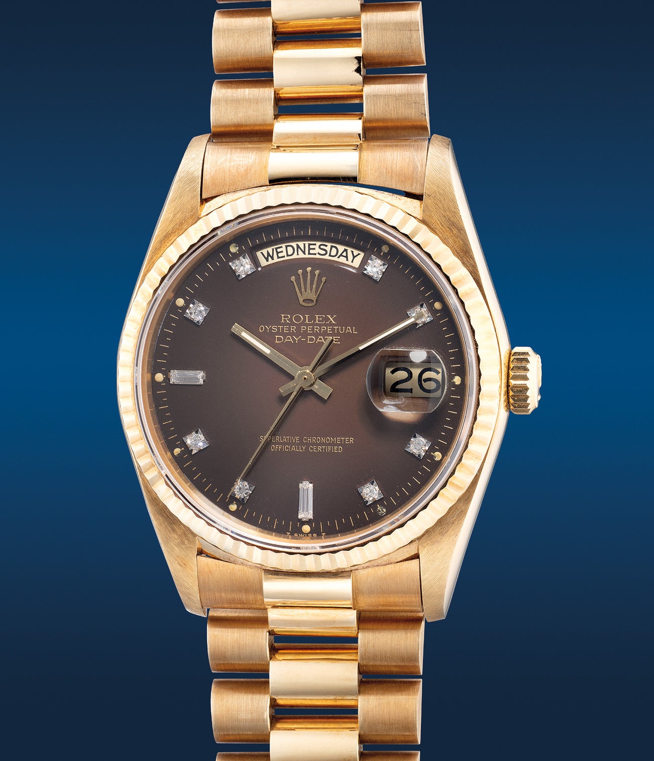 勞力士,「Day-Date」型號18038,非常精細及罕有,黃金自動鏈帶腕錶,備漸變色錶盤、鑲鑽時標、中心秒針、星期、日期顯示,約1988年製。附原裝證書、錶盒