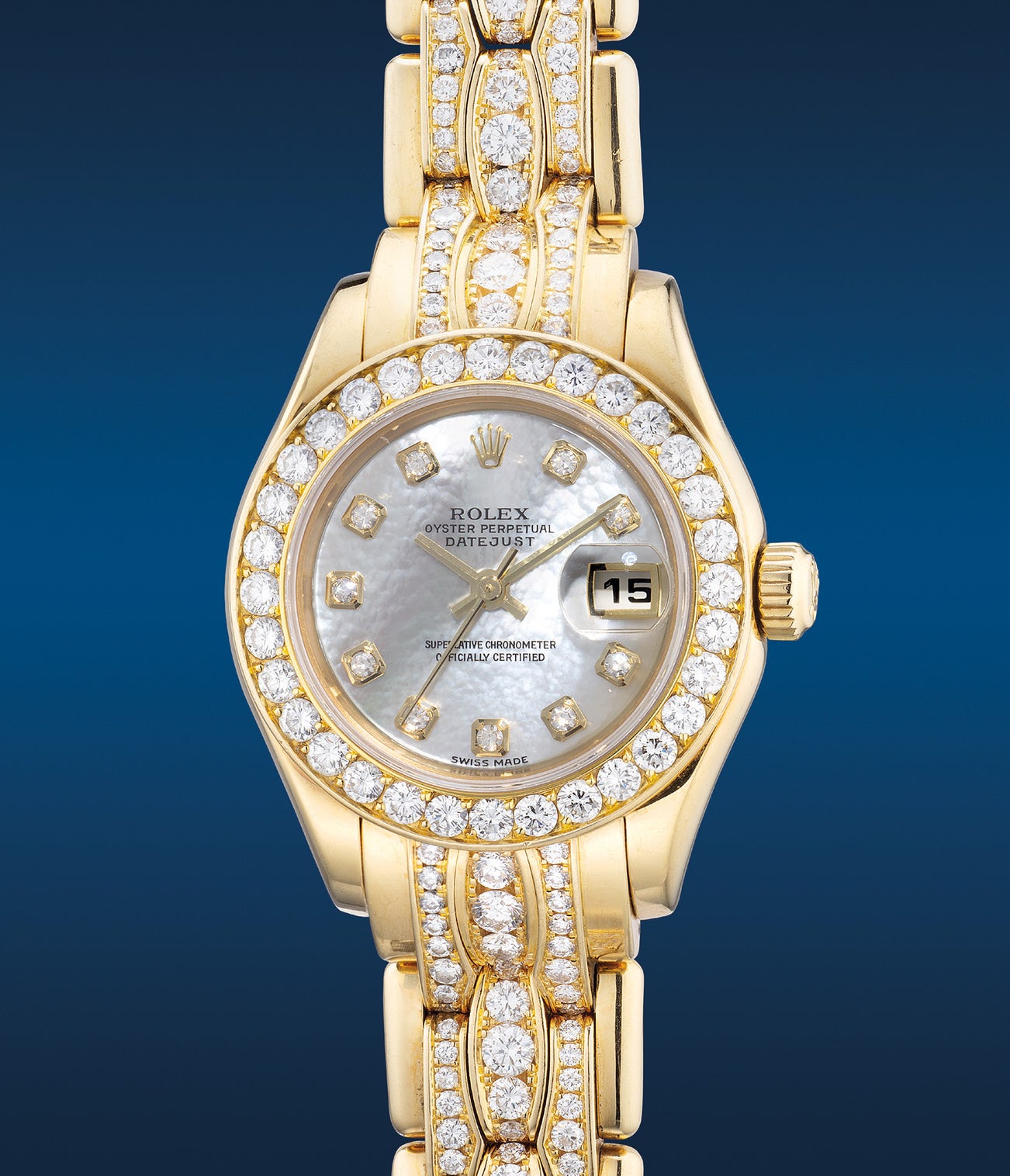 勞力士,「Pearlmaster Datejust」型號80298,精細,女裝黃金鑲鑽石自動鏈帶腕錶,備天然珠母貝鑽石時標錶盤、中心秒針、日期顯示,約2001年製。附原裝證書、錶盒
