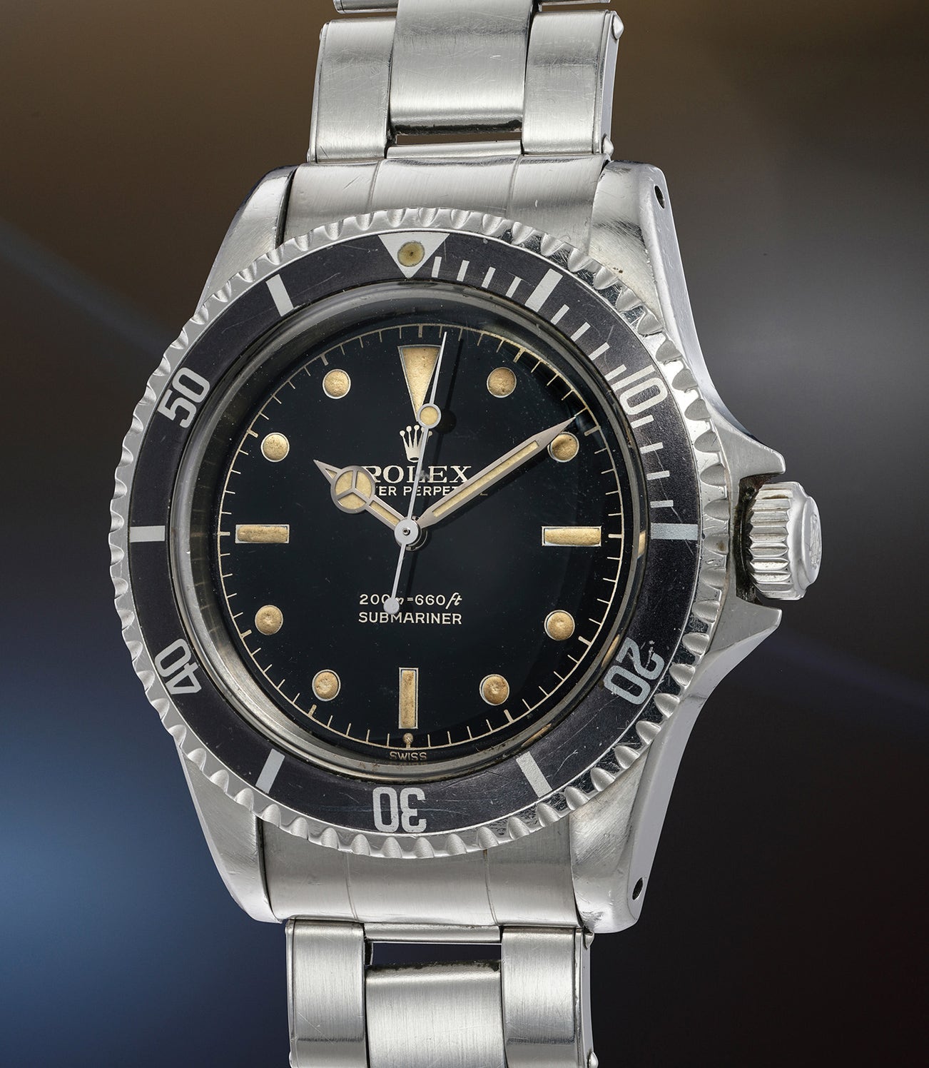 Like many intricacies of collecting vintage Rolex wristwatches, the various iterations of crown guards have developed their own nicknames and followings as the design evolved. The earliest were square-shaped, of which it is estimated very few exist. It is speculated that criticism of the bulky square crown guard prompted Rolex to modify the cases they had in stock, giving rise to the “eagle beak” crown guard. Finally, Rolex produced cases with unobtrusive pointed crown guards (sometimes abbreviated by collectors as PCG), as found on the present example. These early Submariners were fitted with stunning black glossy dials and featured either two or four lines of text at 6 o’clock with gilt printing in either silver or gold (or both). By the late-1960s, the crown guards were changed to a rounder design that is still in use today.