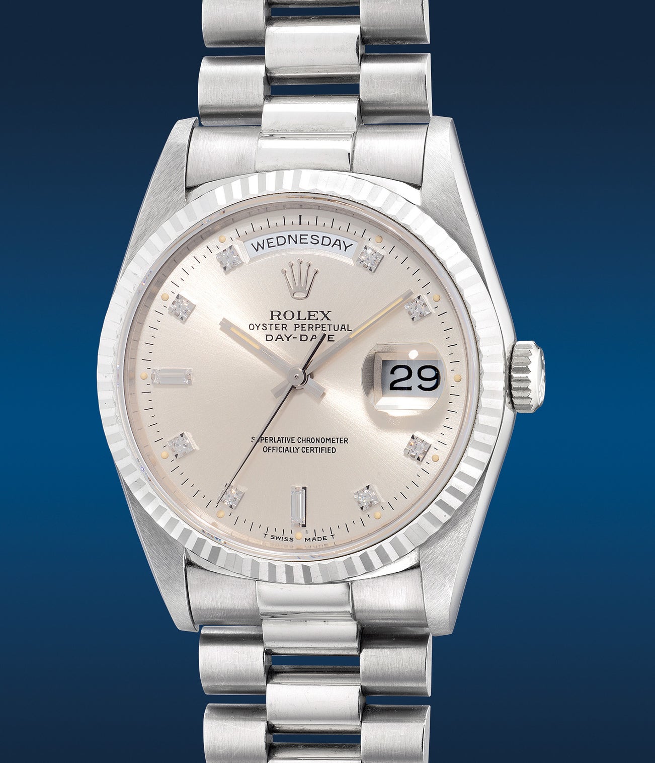 勞力士,「Day-Date 」型號18239,十分精細,白金自動鏈帶腕錶,備中心秒針、日期、星期顯示、鑽石時標,約1990年製