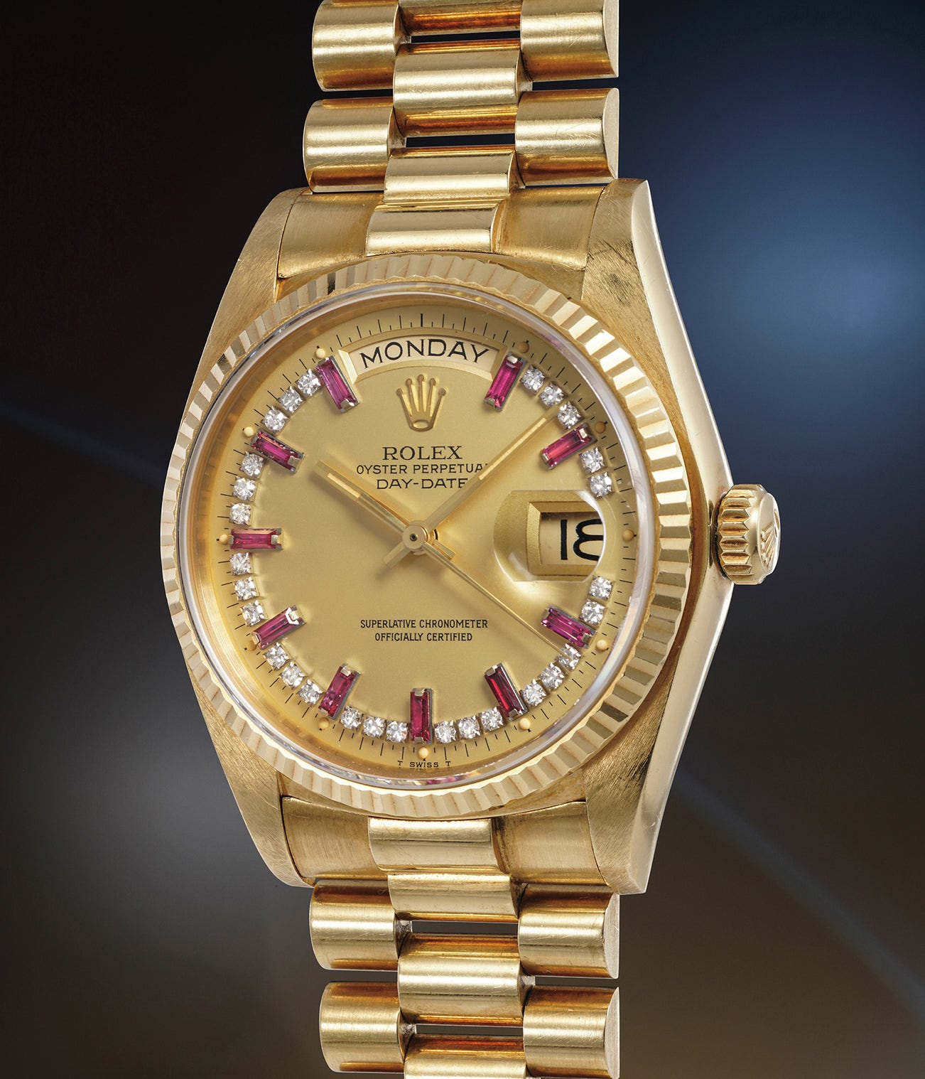 Produced between 1977 and 1988, reference 18038 is characterized by its yellow gold case, bracelet and fluted bezel. The model most notably features a sapphire crystal. It is furthermore distinguished by the diamond and ruby-set champagne dial, giving it an incredibly glamorous edge. Furthermore, the case is preserved in excellent condition with crisp edges and sharp finishes. It most likely has never seen polishing throughout its lifespan.