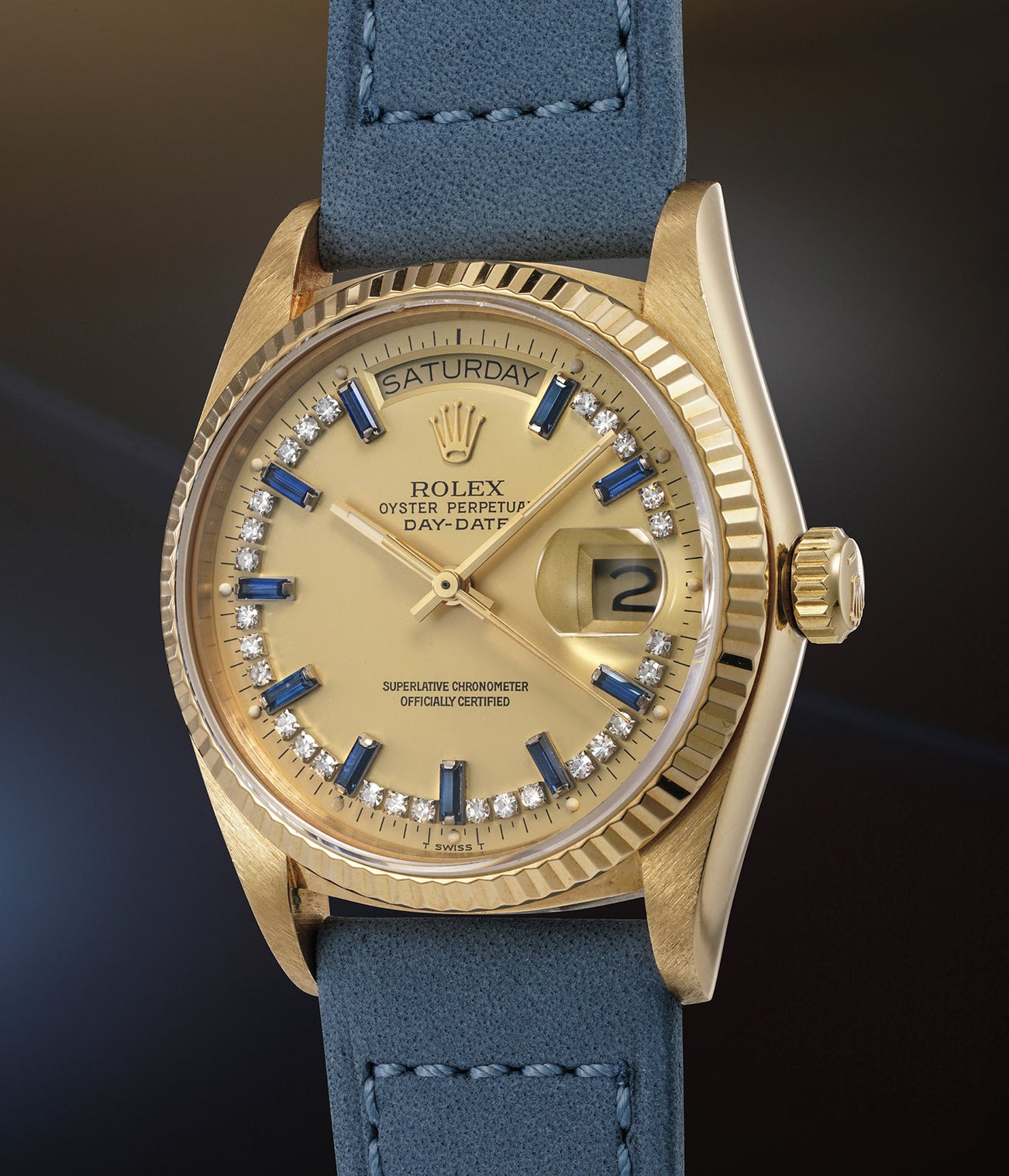 This rare variant of reference 18038 is fitted with a dial displaying beautiful sapphire baguette-set numerals and champagne tone. It is furthermore preserved in excellent and impressive condition. The case has probably never seen polishing throughout its lifetime, and the dial displays luminous dots that are round and intact, having aged with warm patina.