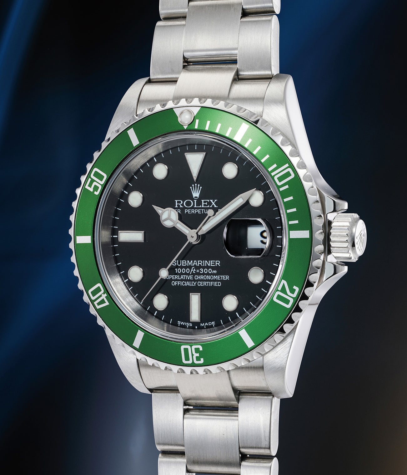 Preserved in astounding condition, the watch spent very little time on the wrist, but its most notable feature is the "flat four" bezel, which can only be found on earliest generation reference 16610LVs and is recognised by the top of the number “40” on the bezel which is markedly wider (“flatter”) than later iterations. Due to its rarity, this variant is particularly popular among collectors today.