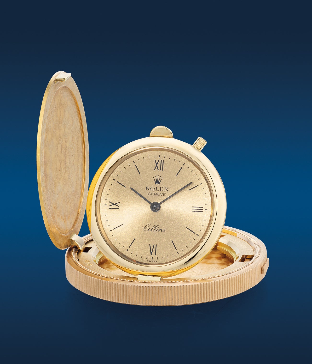 Although Rolex is most recognised for its robust sports watches, its catalogue is incredibly varied, and even includes a small collection of coin watches that are very rare and hardly ever appear on the market. The present ref. 3612 is a dainty timepiece, encased in a yellow gold twenty US dollar coin from 1900. The present example truly encapsulates the essence of the Rolex Cellini line with no intricate detail left unattended. Featuring a seamless button that reveals its dial with a single touch, the walls concealed within the watch are manually decorated with perlage finishes. Devoted to Benvenuto Cellini, a master goldsmith of the 16th century, the Cellini collection very much takes after his dedication to methods of engraving, casting metal and perfecting even the most minute details.