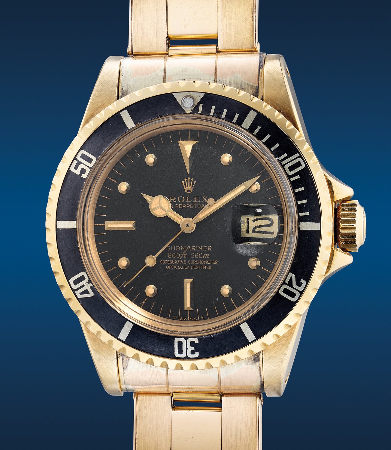 Adding a hint of flare and flamboyance to the famed professional diver’s wristwatch, gold examples were offered with two options, a matte black dial with a black bezel insert or a metallic blue dial with a blue bezel insert. Equally stunning in each combination, the present example features a well-preserved matte black nipple dial with a matching black bezel. Extremely masculine and stunning, the gold date wheel is a perfect contrast against its rich dial, a truly coherent design through and through. The black bezel insert has slightly aged with a faded gun metal grey, giving this watch a taste of vintage charm. Presented in an attractive overall condition and paired with an 18K gold Rolex Oyster bracelet, this is the Submariner that won’t go wrong dressing up or down.