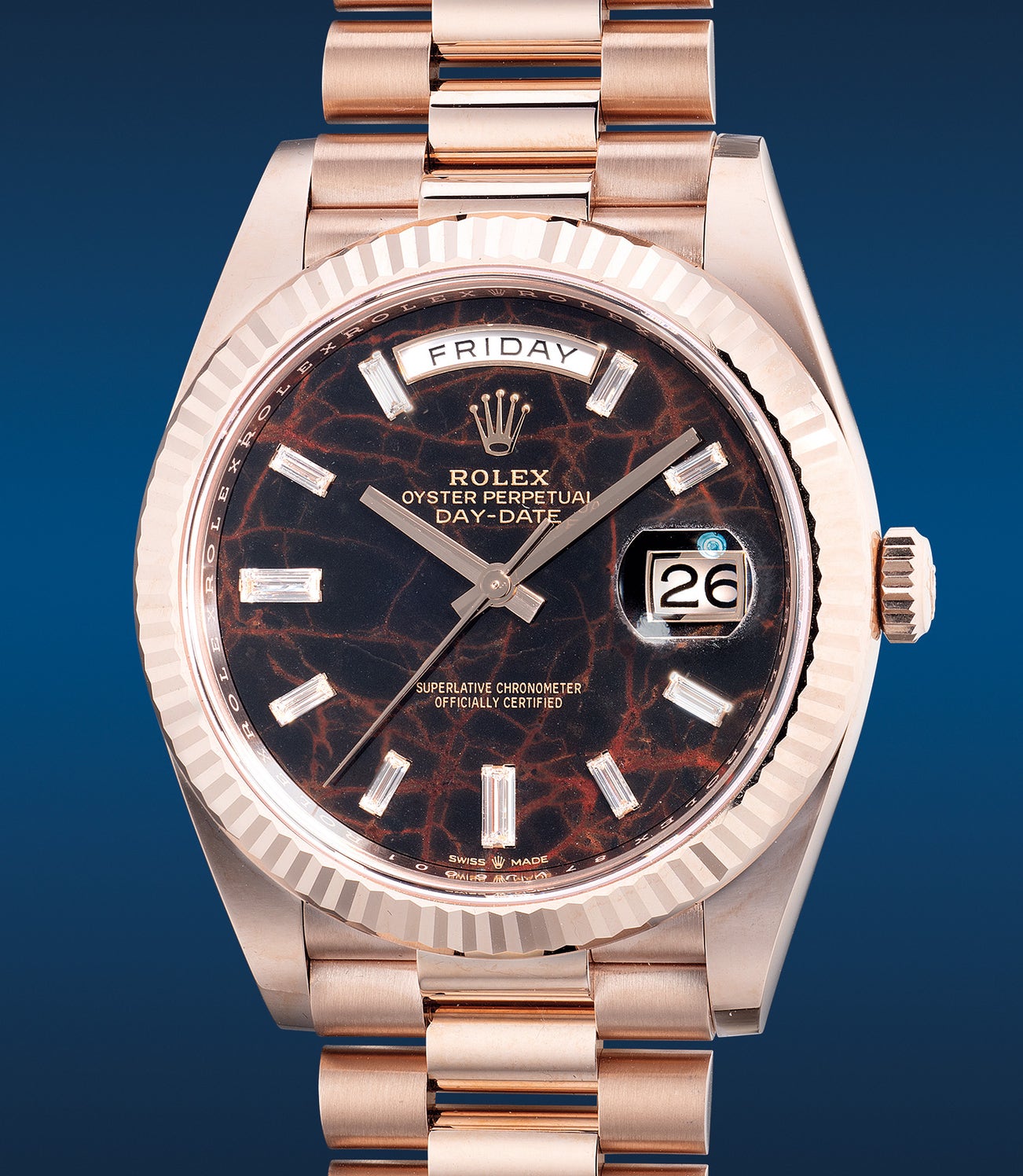 勞力士,「Day-Date」型號228235, 精細罕有,玫瑰金自動鏈帶腕錶,備天然含鐵石英錶盤、條鑽時標、中心秒針、日期、星期顯示,約2001年製。附錶盒、原裝證書