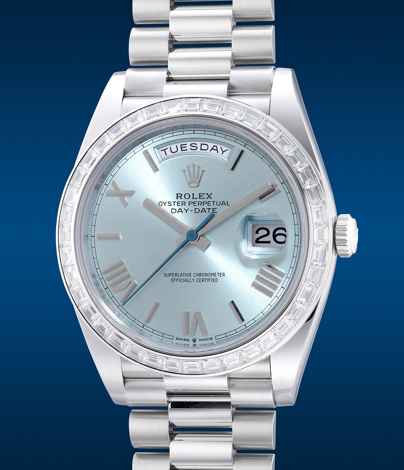 Presented in a stunning condition, the present Day-Date 40 ref. 28396TBR not only ticks the boxes for unparalleled accuracy and opulence, but most attractive of all, rarity. Cased in the coolness of platinum, the sublime sunburst ice-blue dials are reserved exclusively for platinum models, making this timepiece one hard to ignore. A breath of freshness surrounded by the brilliance of a baguette-diamond set bezel, the hour markers are paired with Roman numerals and finishes with a blued seconds hand that glides across the glacial like dial with charm. Complete with its full accessories, this hefty Day-Date 40 is exquisite.