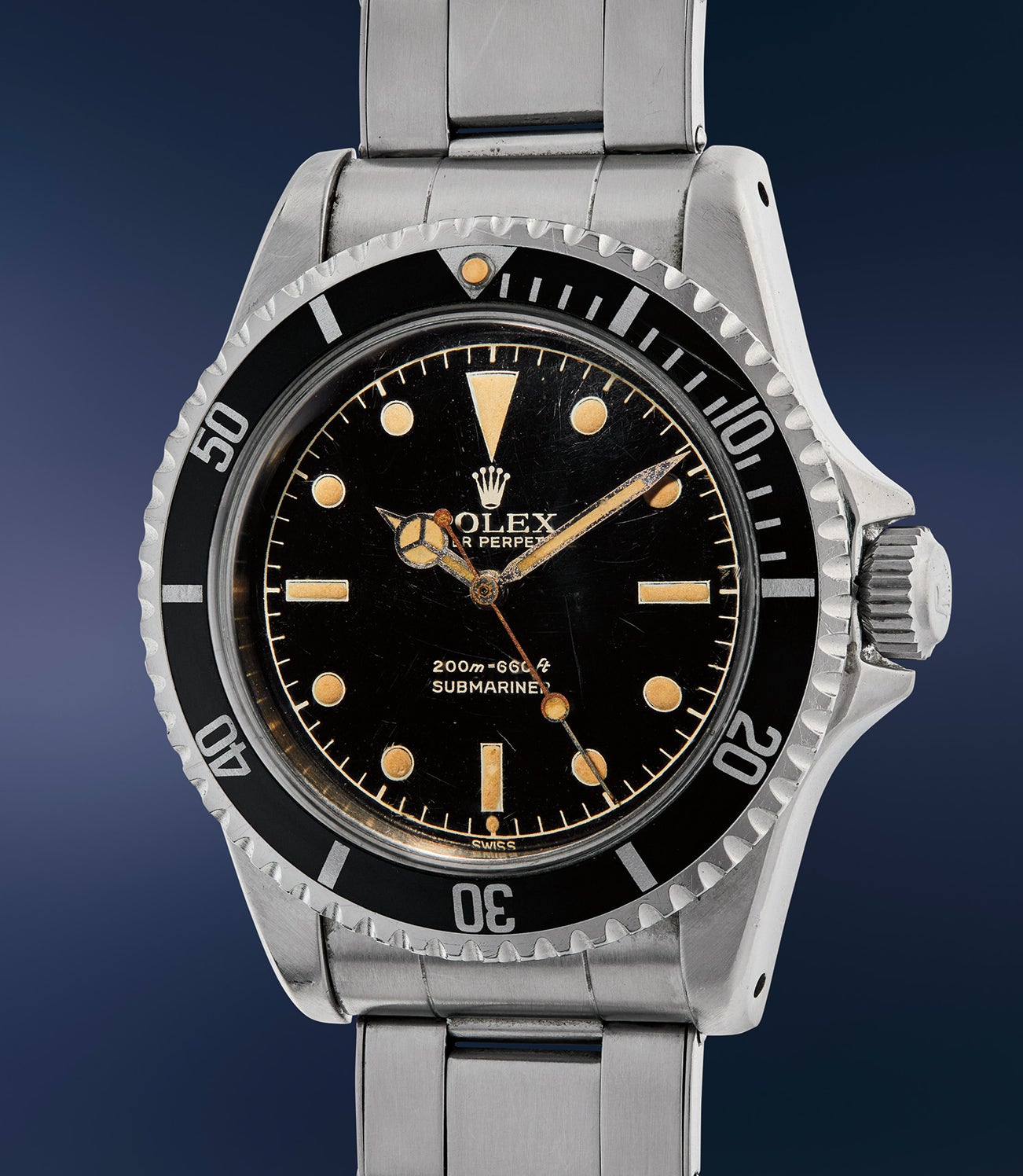 Like many intricacies of collecting vintage Rolex wristwatches, the various iterations of crown guards have developed their own nicknames and followings as the design evolved. The earliest were square-shaped, of which it is estimated very few exist. It is speculated that criticism of the bulky square crown guard prompted Rolex to modify the cases they had in stock, giving rise to the “eagle beak” crown guard. Finally, Rolex produced cases with unobtrusive pointed crown guards (sometimes abbreviated by collectors as PCG), as found on the present example. These early Submariners were fitted with stunning black glossy dials and featured either two or four lines of text at 6 o’clock with gilt printing in either silver or gold (or both). By the late-1960s, the crown guards were changed to a rounder design that is still in use today.